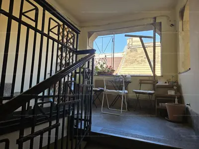 A lakás egy tégla építésű társasház legfelső, 4. emeletén található. Az egyetlen lakás a szinten, így nincsen semmi átjárás. Kialakításra került az elszeparáltság miatt egy privát, kiülős, személyes teraszrészlete! Sok további akár tárolási lehetőséget tud nyújtani a teljes privát folyosó! A társasházban nincs lift.
