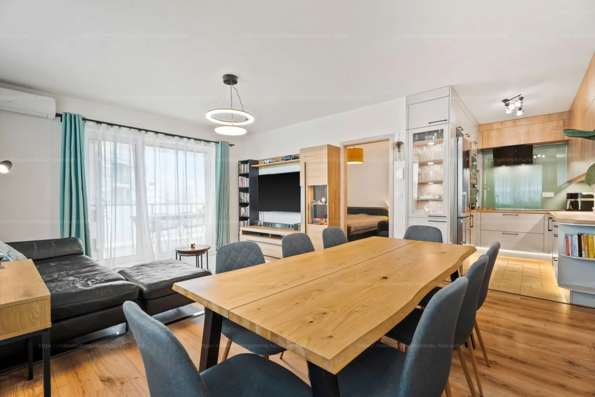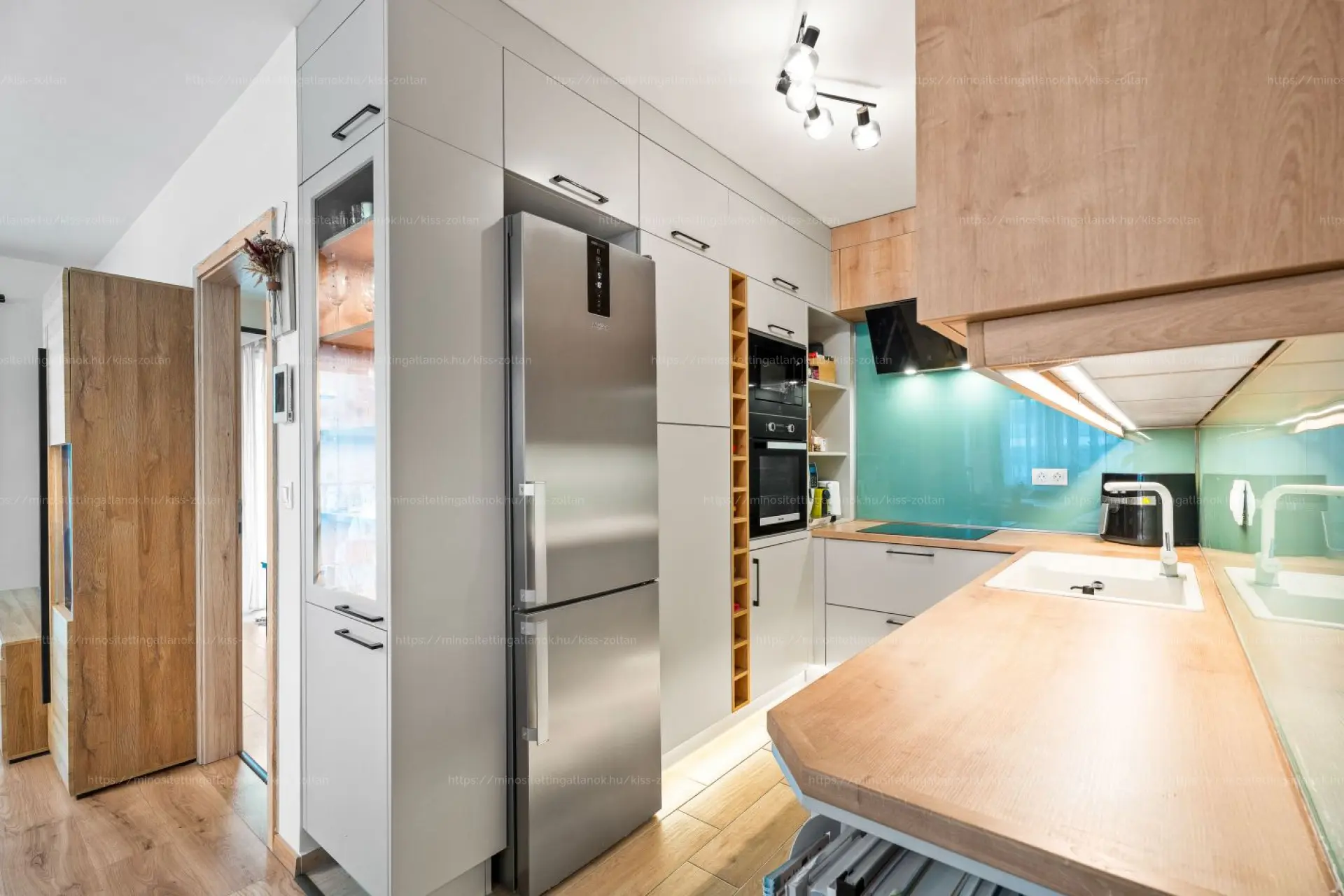 A lakást igényes burkolatokkal látták el, a konyha teljesen beépített és gépesített, minőségi konyhabútorral felszerelt. Több egyedi beépített bútor is helyet kapott, amelyek esztétikailag és funkcionálisan is tökéletesen illeszkednek a lakás modern stílusához. Az ingatlan állapota kifogástalan és szinte azonnal költözhető.