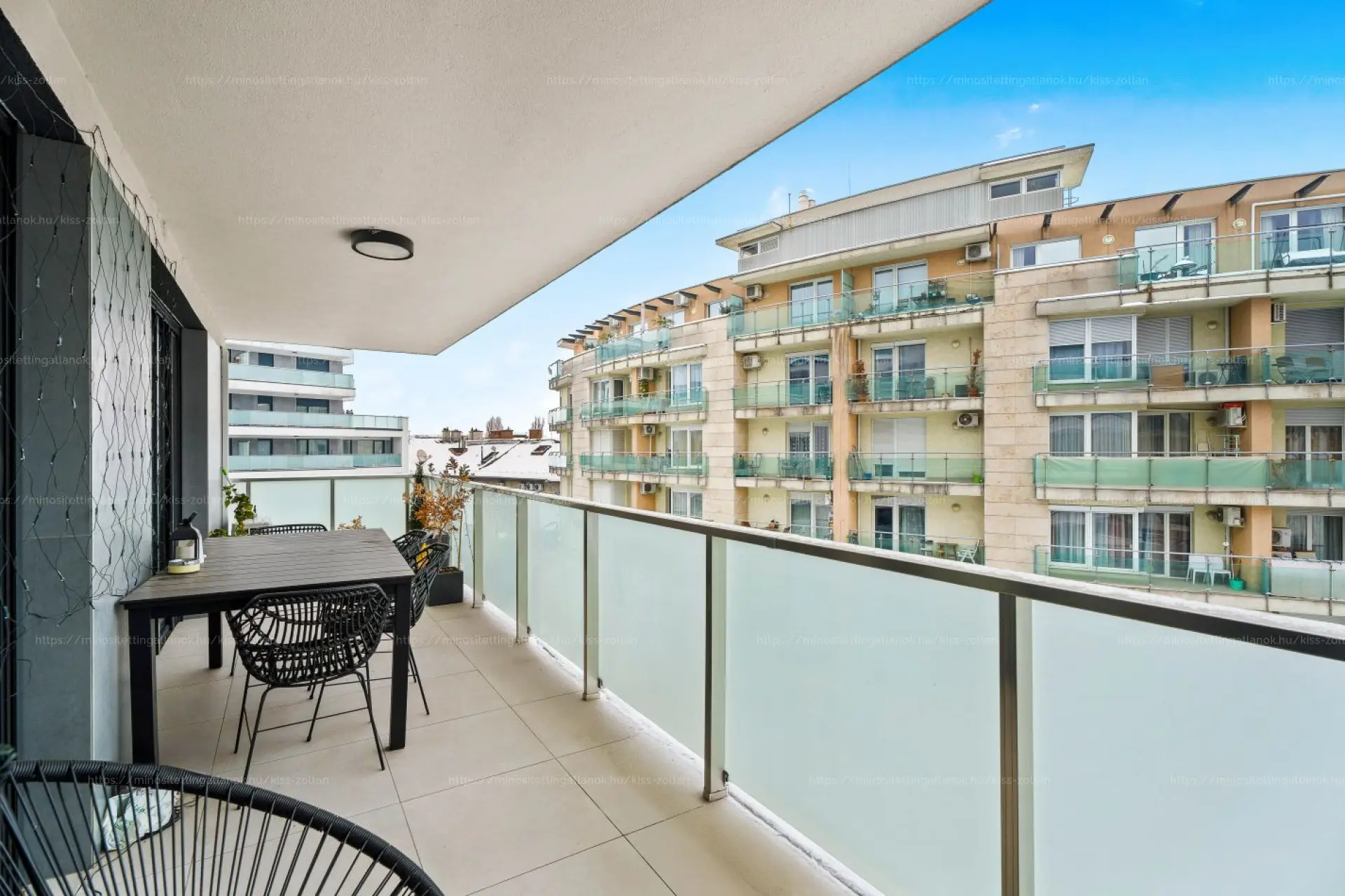 Az ingatlan a társasház 6. emeletén helyezkedik el, hasznos lakóterülete 77 m2, amelyhez egy 17 m2-es, keleti fekvésű terasz is kapcsolódik. A terasz közvetlenül a nappaliból és az egyik hálószobából is megközelíthető, így a lakás egész nap világos, napfényes, ideális teret biztosít a pihenéshez vagy akár a reggeli kávé elfogyasztásához.