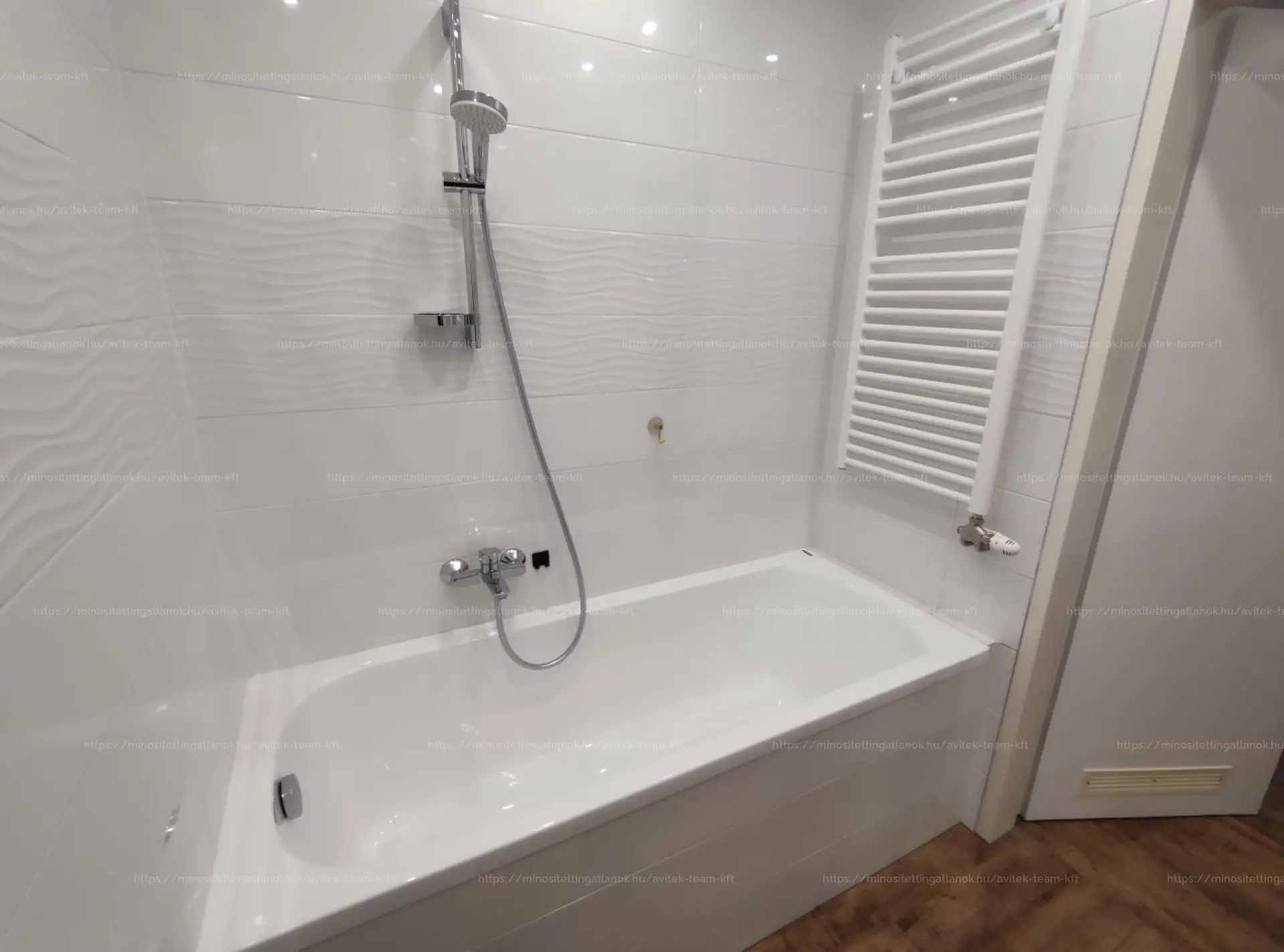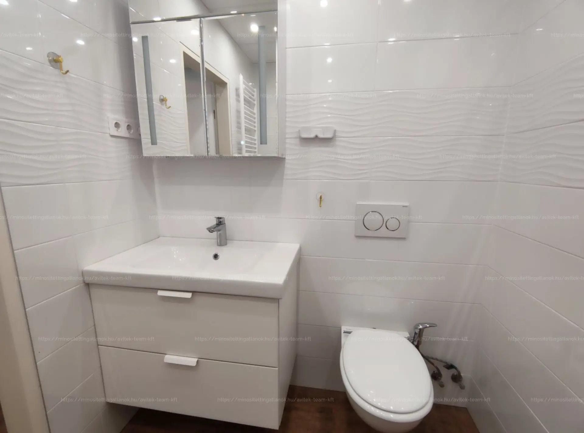A szintén 2 éve felújított fürdőszobában kád, mosdó, toalett és törülközőszárító található.