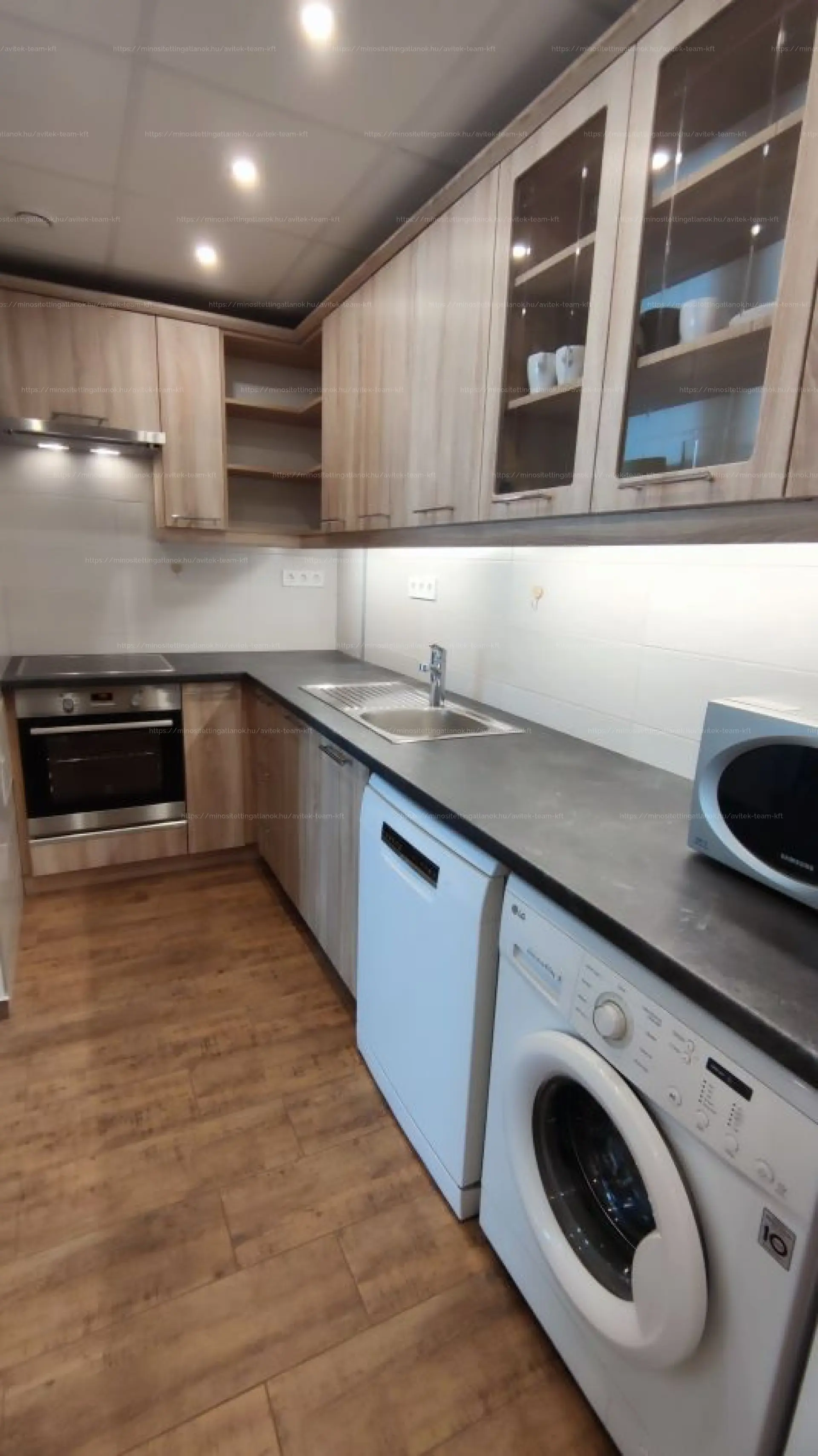 A konyha 2 éve teljesen megújult, új bútorral, gépekkel (elektromos főzőlap, sütő, központi elszívó, mosogatógép, hűtő, mosógép) teljeskörűen felszerelt.