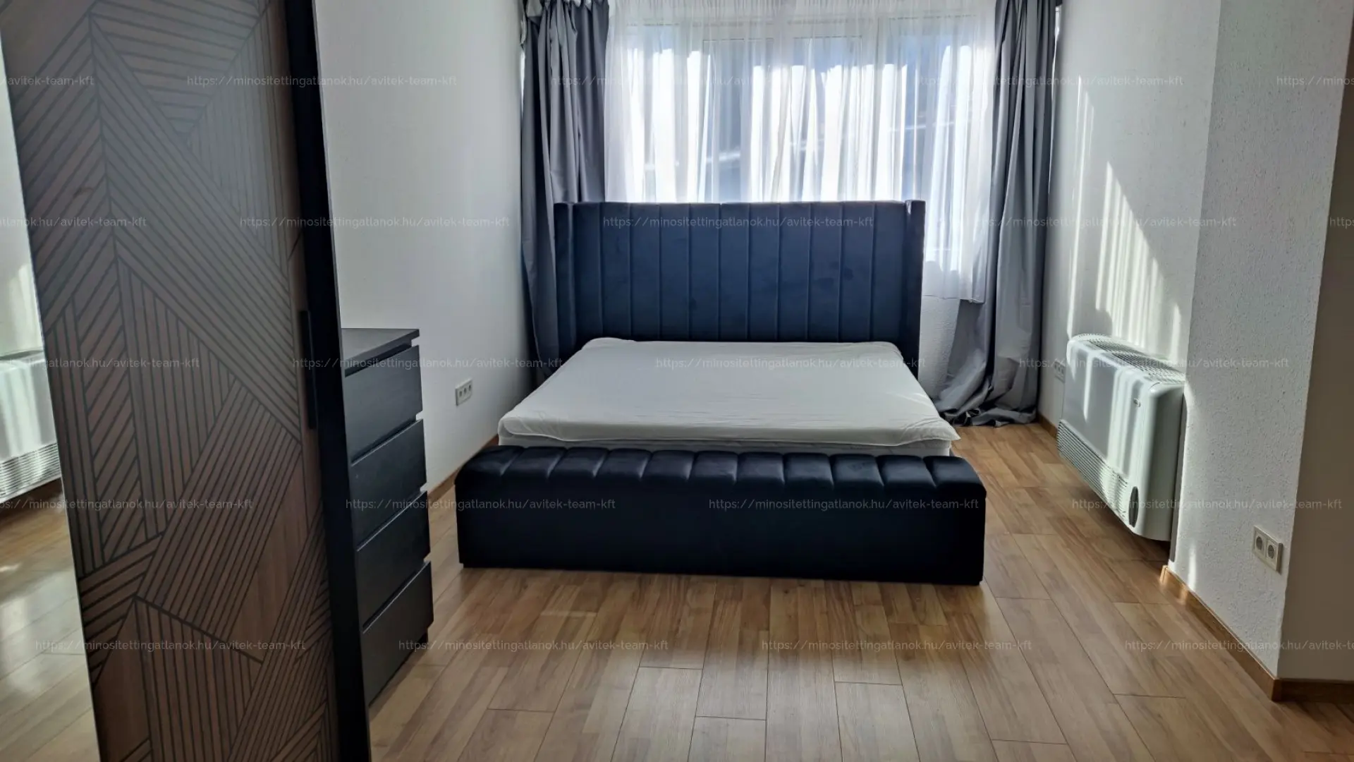 A tágas, külön bejáratú hálószoba franciaággyal és ruhásszekrénnyel berendezett. Az előszobában is beépített szekrény biztosít helyet a tárolásra.