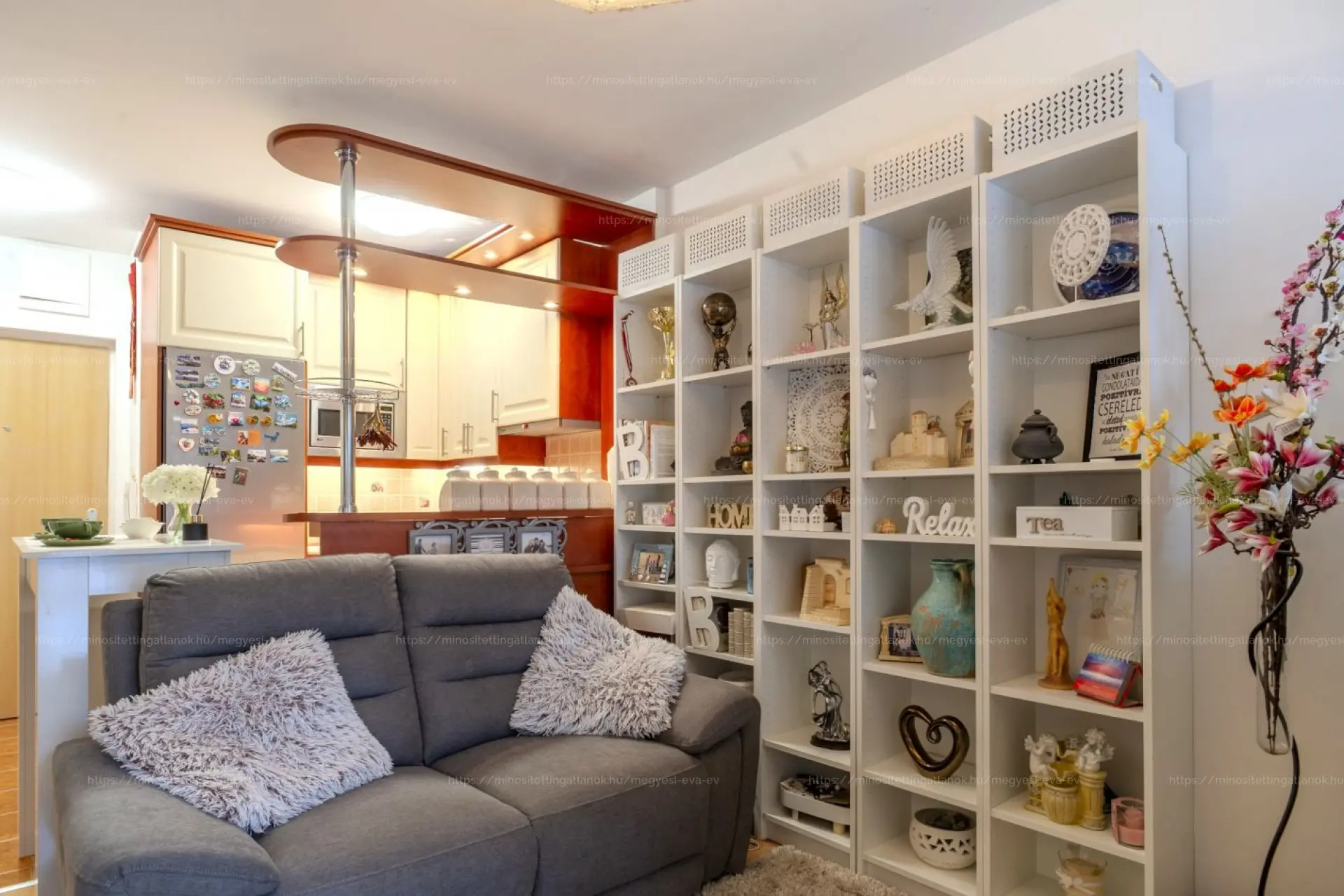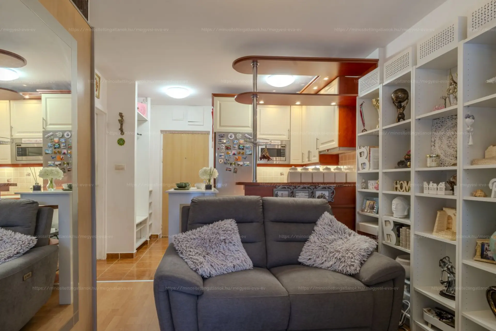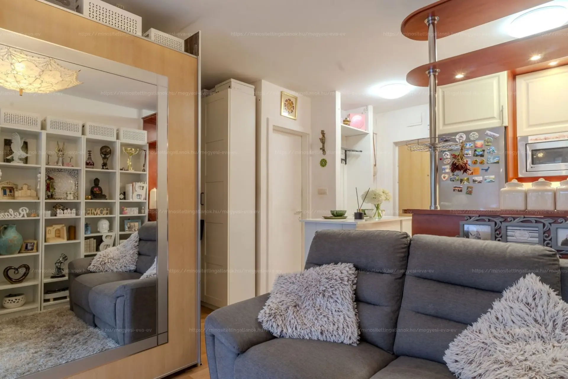 Praktikus elrendezés: egy tágas lakótér konyhával és nappali résszel, amelyből magas szekrényekkel leválasztott HÁLÓZÓNA alakítható. A DK-i tájolásnak és a korszerű, HŐ- ÉS HANGSZIGETELT, REDŐNYÖS, SZÚNYOGHÁLÓS nyílászáróknak köszönhetően VILÁGOS, CSENDES otthon. A szomszéd felé eső fal HANGSZIGETELT, a szoba LAMINÁLT PADLÓS. Gáz NINCS a lakásban.