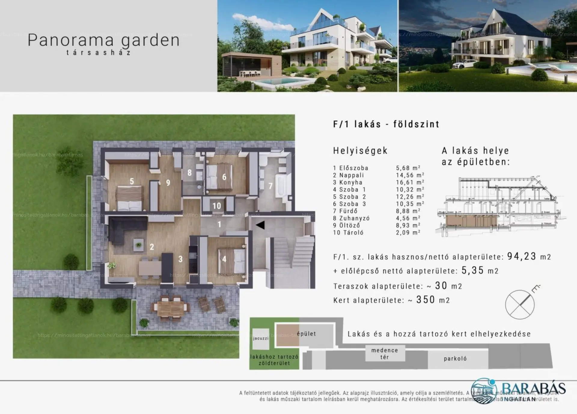 Nettó alapterület: 94,23 m2 + előtér a lépcsőházból (előlépcső): 5,35 m2 + teraszok összesen: 30 m2 + közvetlen kertkapcsolat: 392 m2.