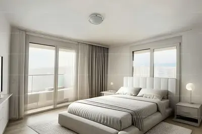 Minőségi burkolatok, szaniterek, alumínium elektromos redőnyök minden ablakon, klíma, hatalmas ablakok találhatóak a lakásban, fürdőszoba is ablakos.