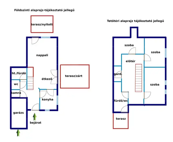 A földszinten elhelyezkedő KÜLÖN KONYHA, MOSÓKONYHA zuhanyzóval, KÜLÖN WC, valamint KAMRA növelik a PRAKTIKUS ÉLETET a házban. Az ÉTKEZŐBŐL és NAPPALIBÓL közvetlen kijárás nyílik két TERASZRA – fedett és nyitott kialakítással – amelyek ideálisak PIHENÉSRE és szabadidős programokra. Remek fényviszonyok teszik barátságossá a TEREKET.