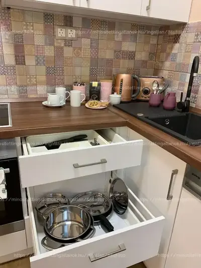A konyha teljesen gépesített (mosogatógép, mosógép). A lakás biztonságát biztonsági bejárati ajtó és okos zár növeli.