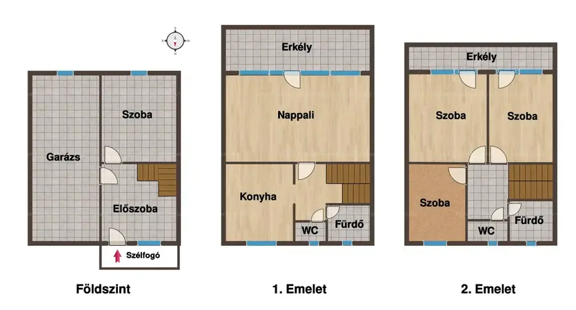 Tetőtér: három külön nyíló hálószoba, külön fürdő és WC