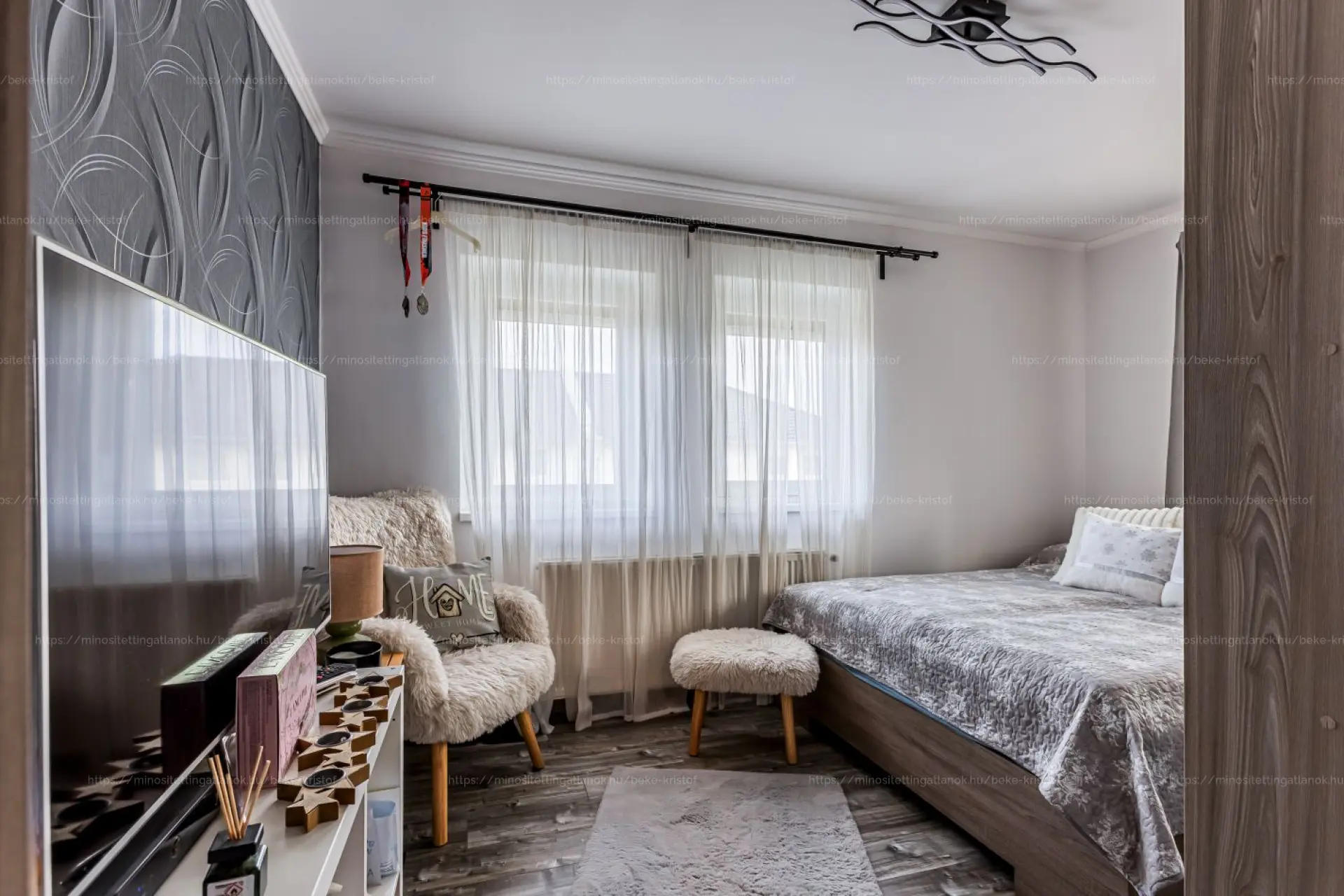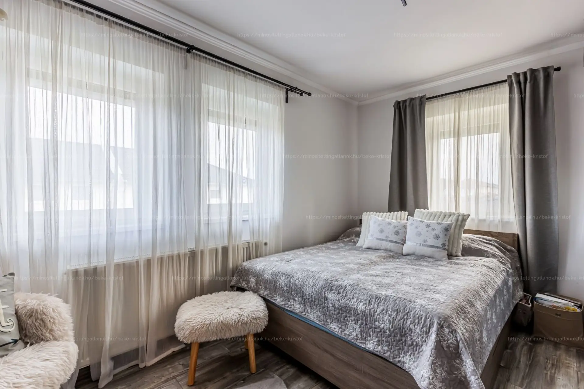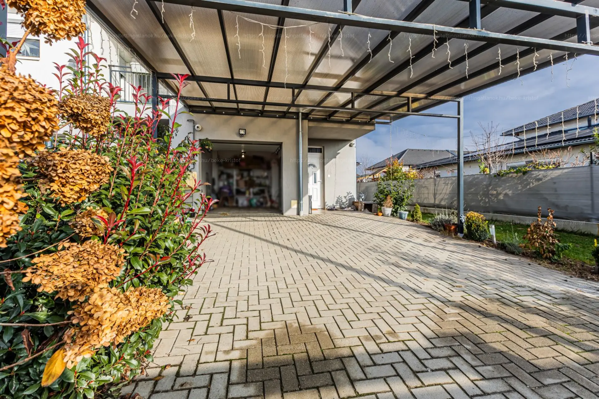 A ház 268 m2-s telken helyezkedik el. Az ingatlant parkosított és gondozott kert veszi körbe. A terület vízellátásáról fúrt kút, az öntözésről pedig automata rendszer gondoskodik. Az ingatlan központi helyisége, a 30 m²-es amerikai konyhás nappali és az innen nyíló 8 m²-es fedett terasz. A nagy üvegfelületek miatt a kinti és benti terek jól kapcsolódnak. Az alaprajz átgondolt, a helyiségek mérete és tájolása megfelelő. A terek tágasak, a ház körbenapozott. Az alsó és felső szint elkülönül, így a szülők nyugodtan pihenhetnek a földszinten, a gyerekek pedig az emeleten vagy a kertben vezethetik le fölös energiájukat. A biztonságról riasztó és kamerarendszer gondoskodik. Az ingatlan tulajdoni lapon csak 85 m2.