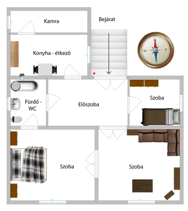 Felső Lakószint: Hall, 2 hatalmas, egymásba nyíló szoba, félszoba, étkező, kamra, 2 bejáratú fürdőszoba-WC.