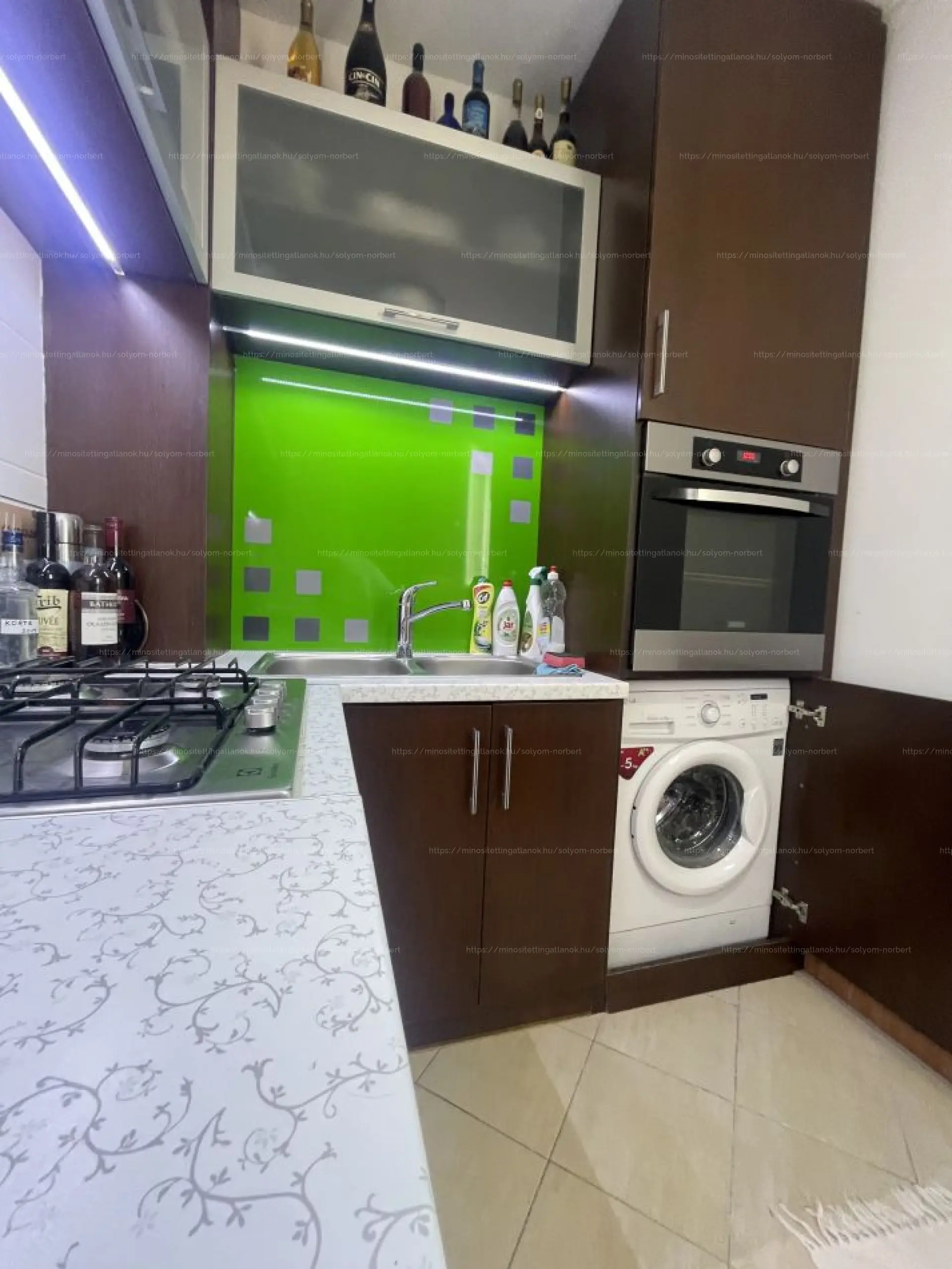 A konyha gépesített, mely magába foglalja a mosogatógépet, gáztűzhelyet, villanysütőt, mosógépet, melyek beépítve, a vételár részét képezik.