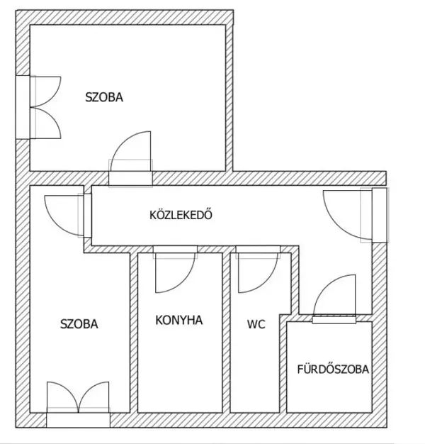 előszoba,fürdőszoba,WC,konyha, 2 szoba.Az egyik szobában egy kis gardróbrész lett kialakítva.