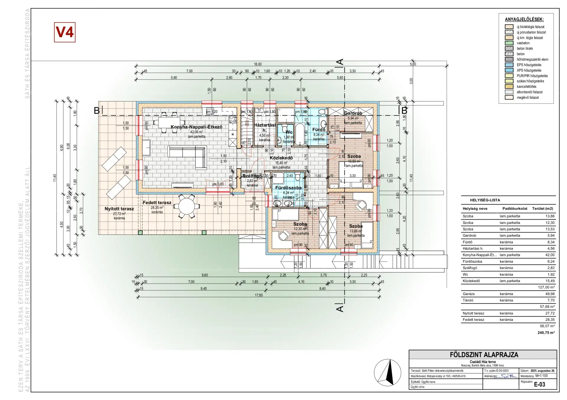 Részletes helyiségek (földszint): Előszoba 3 m2; Ko.-étk.-nappali 42 m2; Szoba-1 14 m2; Szoba-2 12 m2; Szoba-3 14 m2; Fürdő-1 8,00 m2; Fürdő-2 6 m2; Gardrób 6 m2; Közlekedők és lépcsőház összesen 15 m2 —