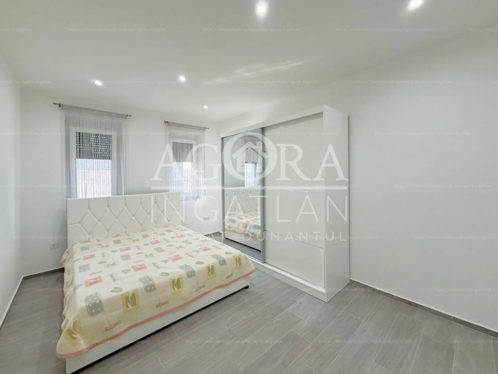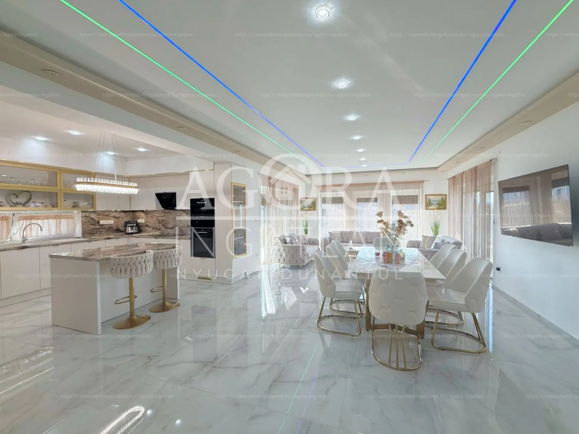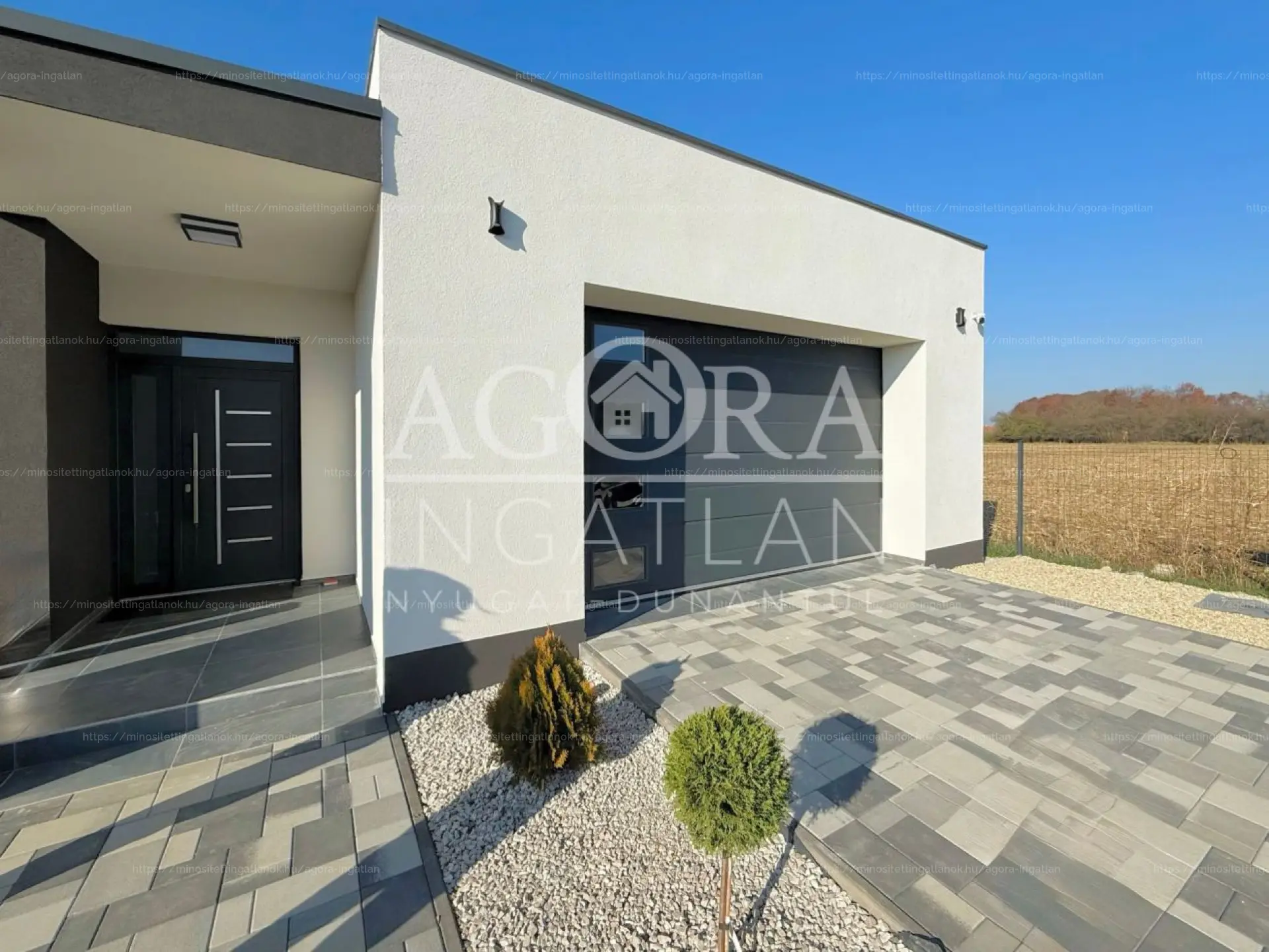 - Helyiségek: amerikai konyhás nappali (65 m²), 3 hálószoba, 2 fürdőszoba, háztartási helyiség, 2 fedett terasz, 33 m²-es garázs