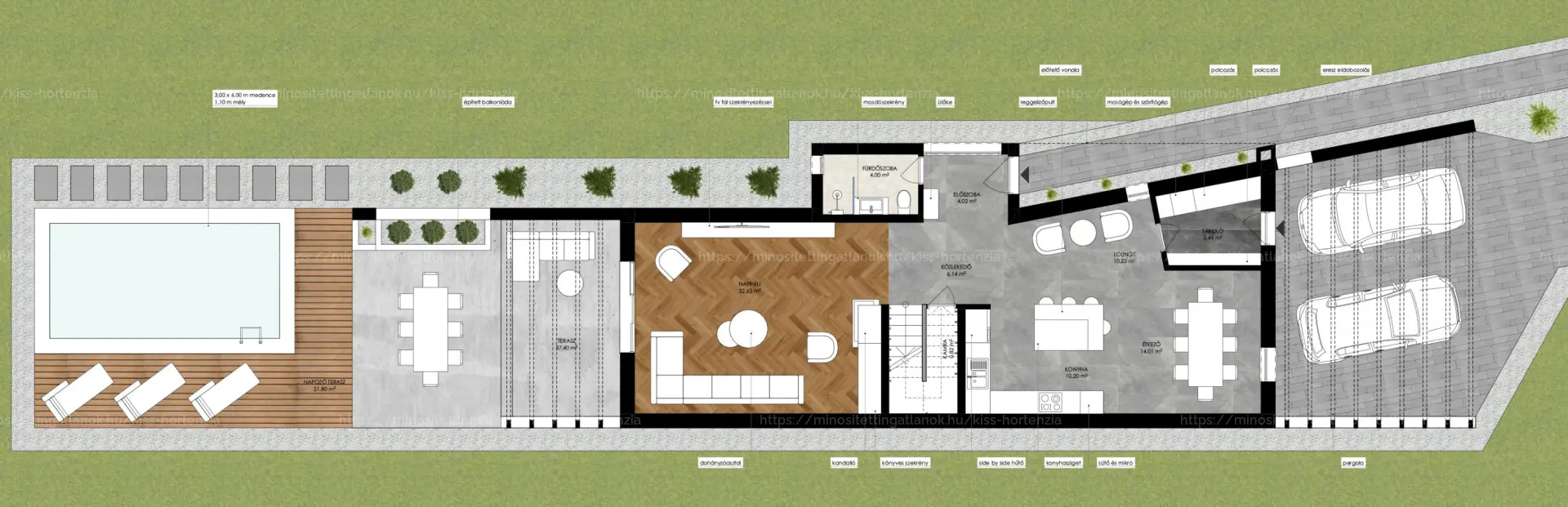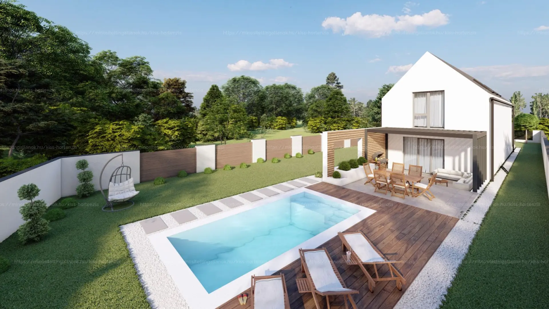 🌿 746 m²-es gondozott kert, medence, dupla fedett kocsibeálló