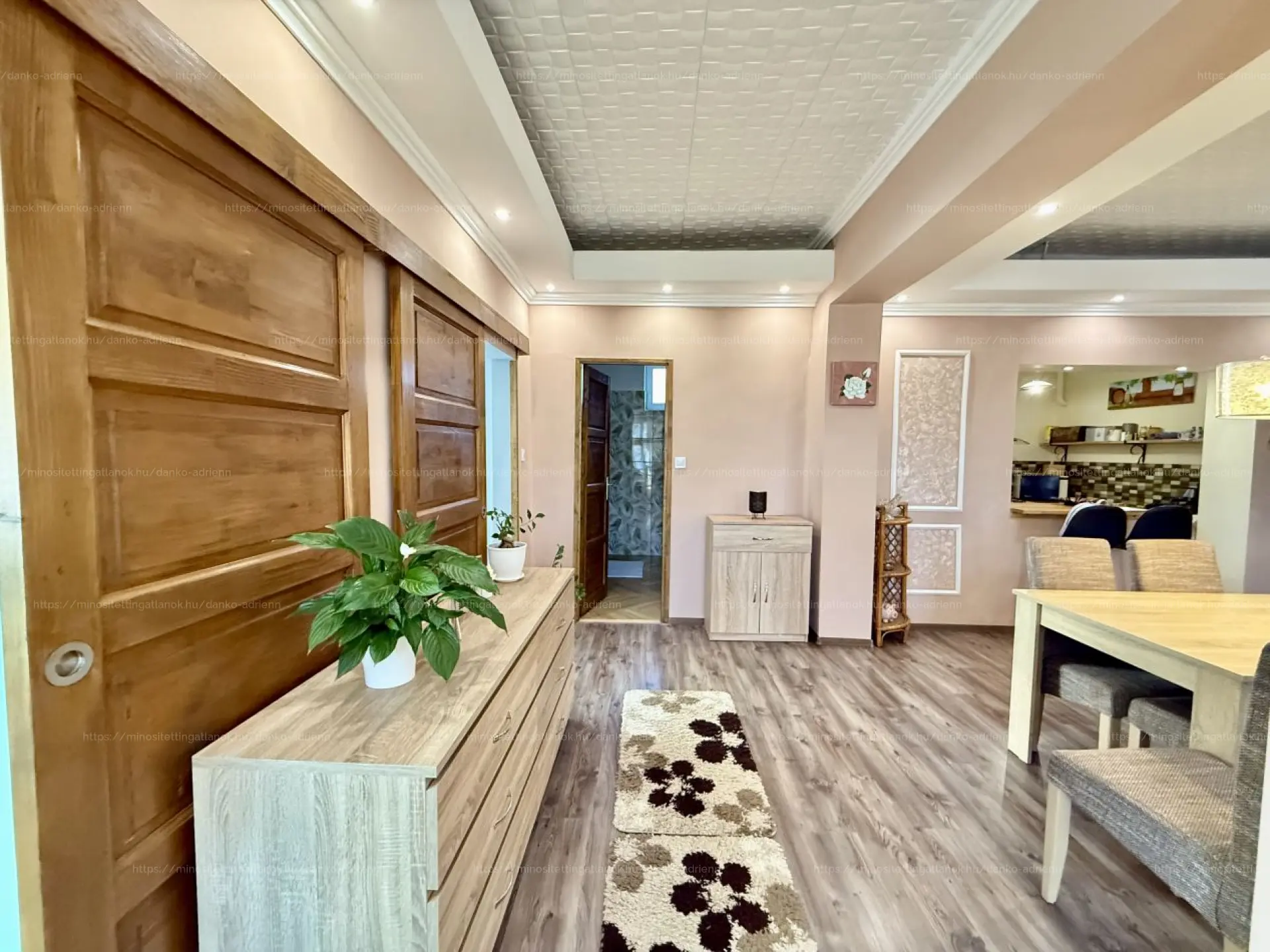 - 2 szoba, 1 hobbiszoba, 2 fürdőszoba (egyik kádas, másik zuhanyzós), 34 m2-es amerikai konyhás nappali, kamra. A harmadik szoba visszaállítható kartonozással (ugyanis azt egybenyitották az étkezővel a felújítás során).