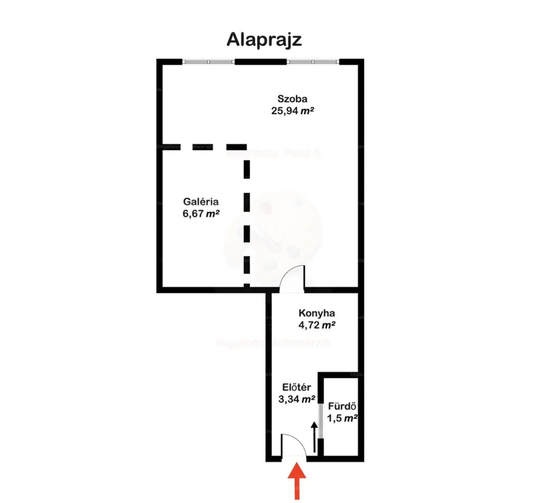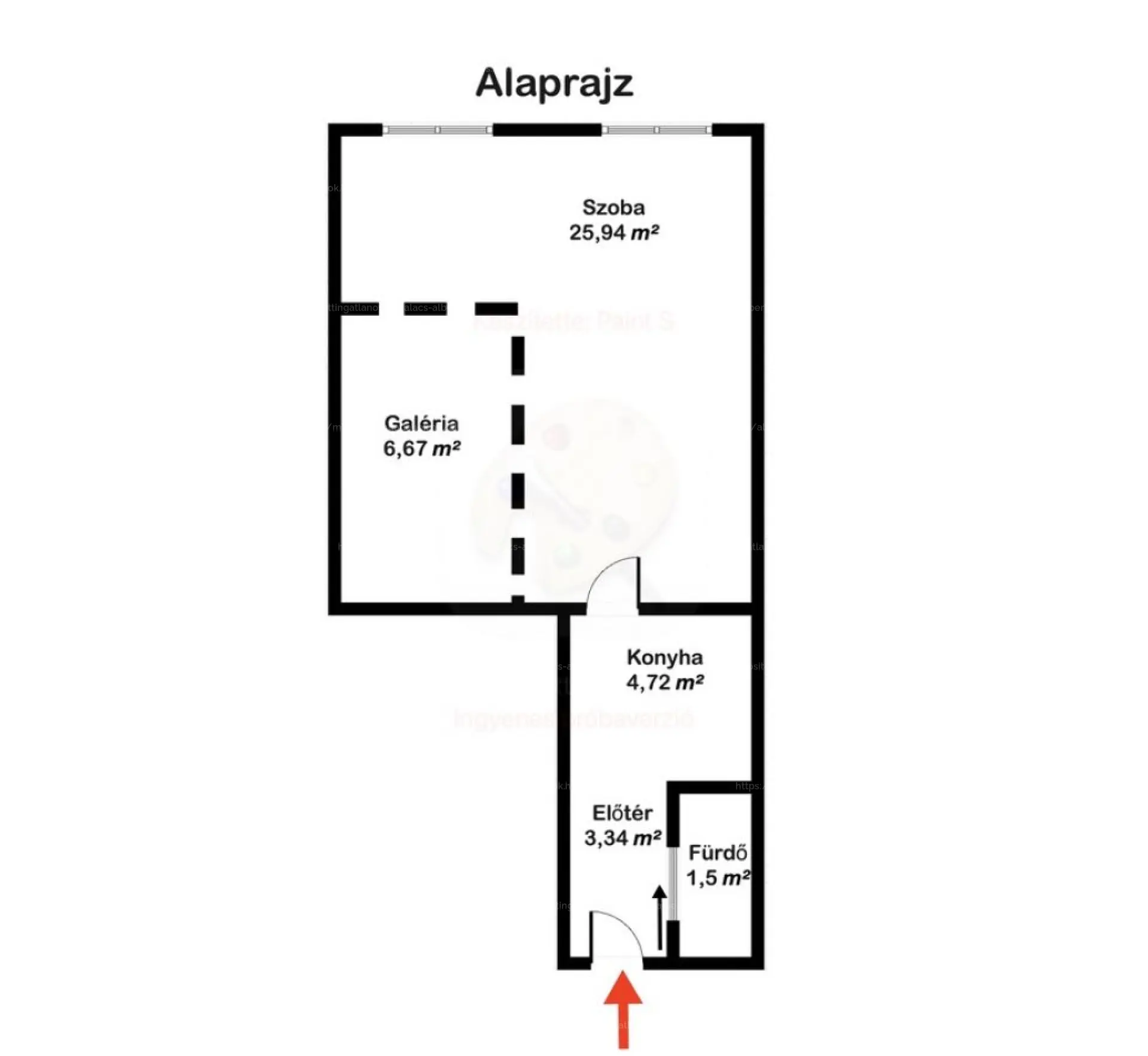 A lakás elrendezése praktikus és jól kihasználható: az előtérből nyílik a konyha és a fürdőszoba, majd a tágas, utcai nézetű nappali, ahol a magas belmagasság lehetővé tette egy galéria kialakítását – külön hálózónaként szolgálva.
