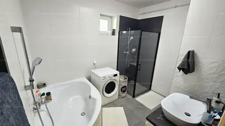 Fürdőszoba épített zuhanykabinnal, sarokkáddal és WC-vel