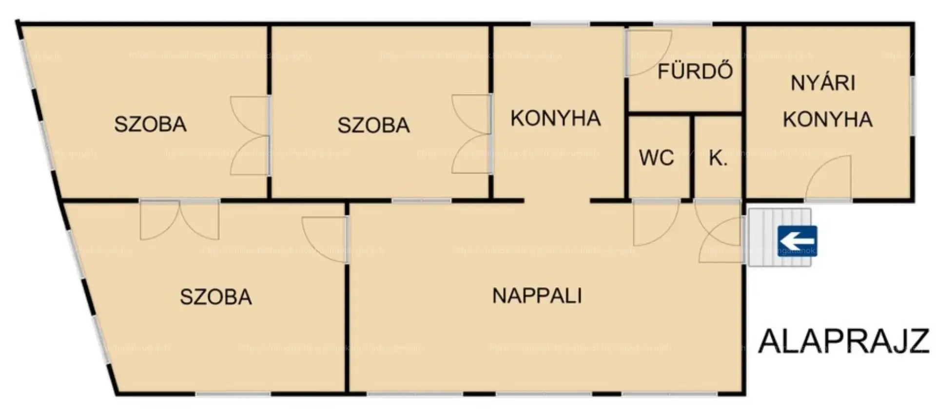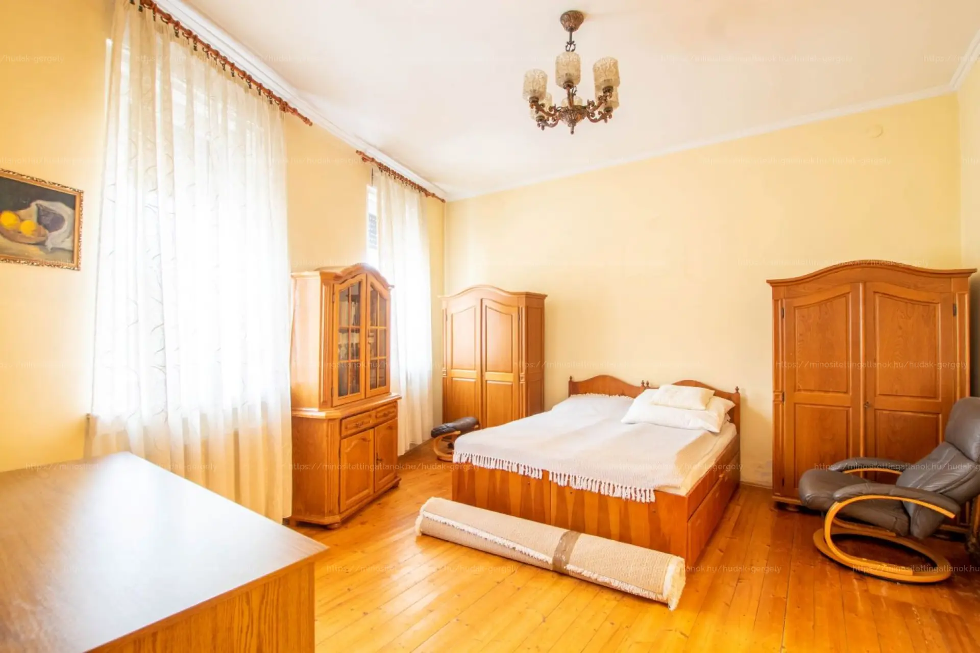Helyiségek: nagy méretű, széles ablakokkal rendelkező nappali, 3 szoba, konyha, fürdő, wc-mosdó, kamra. A nappaliban hűtő-fűtő klíma van beépítve a hőmérséklet szabályozásában.