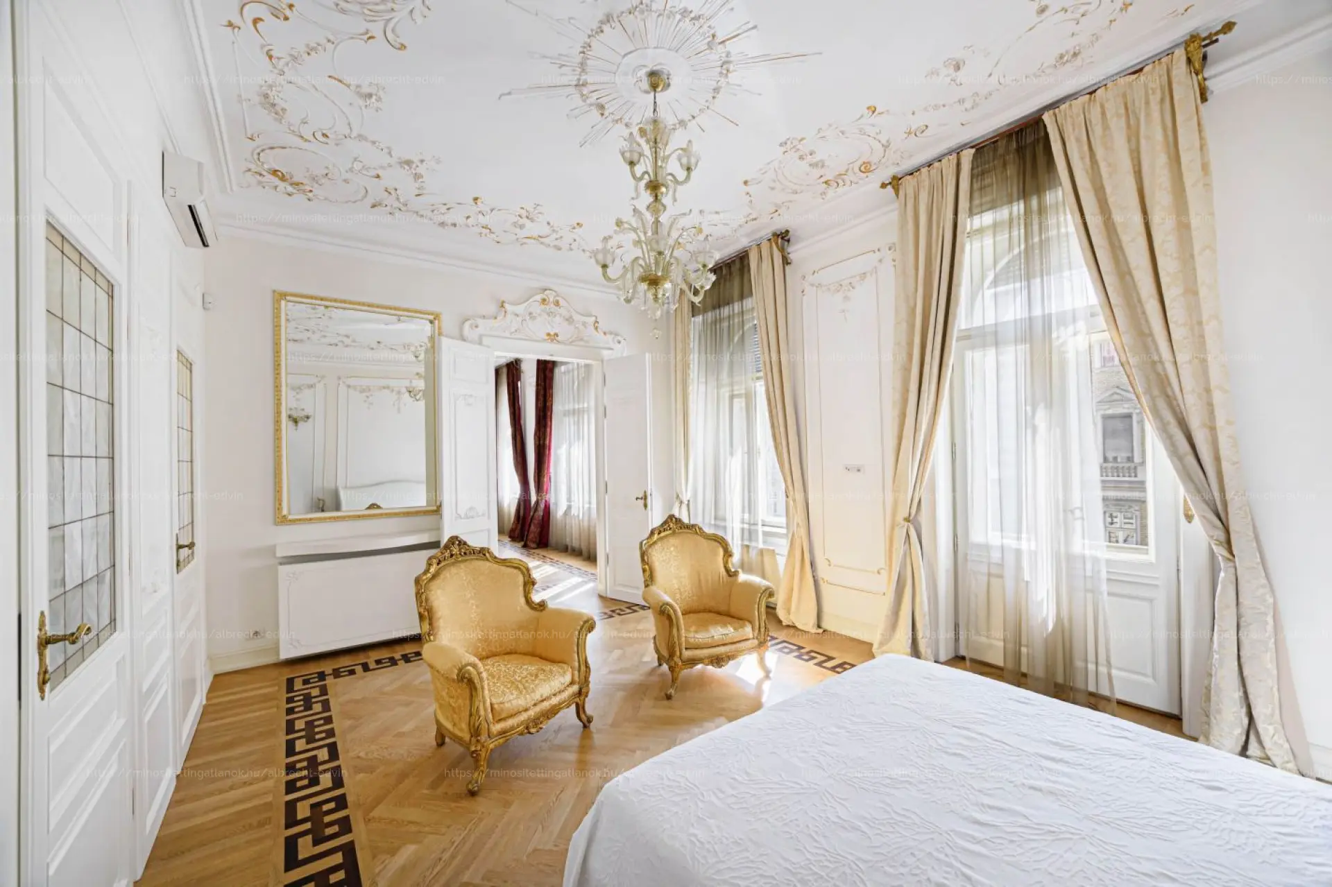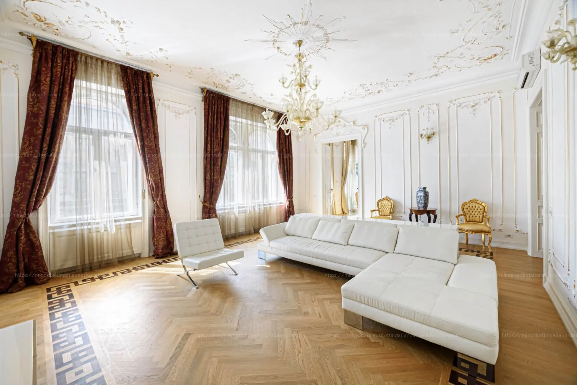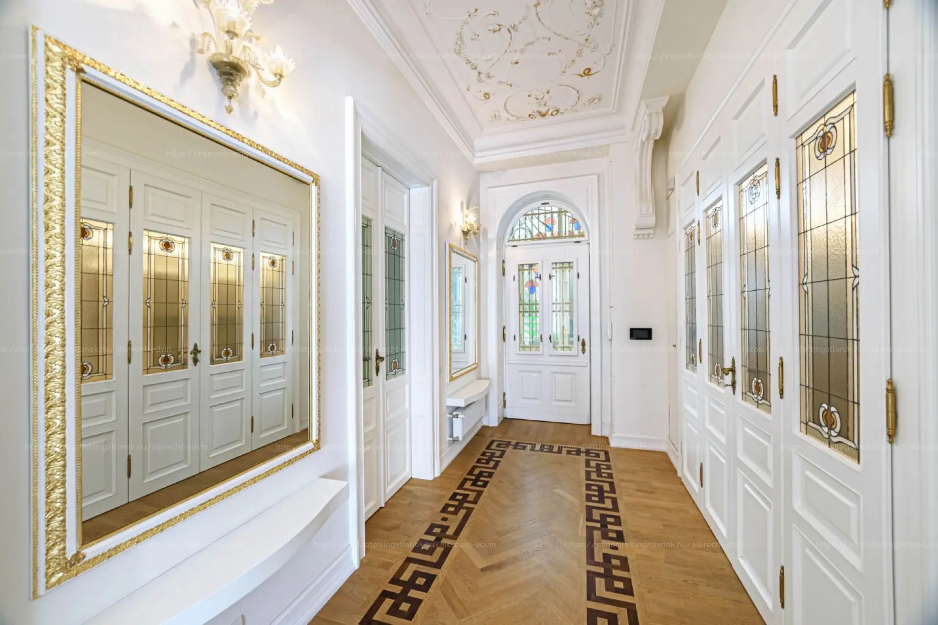 Az impozáns nagy terekkel rendelkező ingatlan falai a századfordulós gipsz stukkó berakásokkal igazi elegáns nagypolgári hangulatot árasztanak.