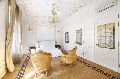 Az impozáns nagy terekkel rendelkező ingatlan falai a századfordulós gipsz stukkó berakásokkal igazi elegáns nagypolgári hangulatot árasztanak.