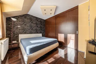 Az emeleten van egy nagyobb hálószoba fürdőszobával, amit akár méretéből adódóan ketté is lehet választani ,így kaphatunk egy másik szobát is.