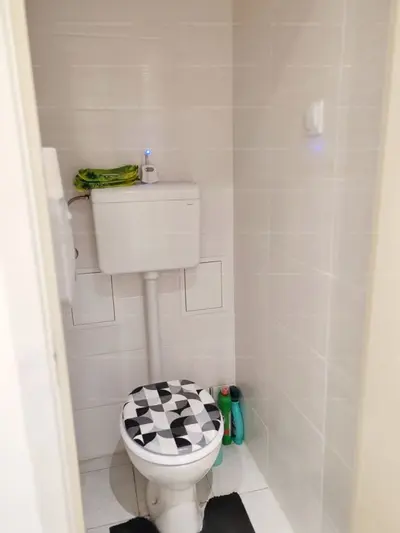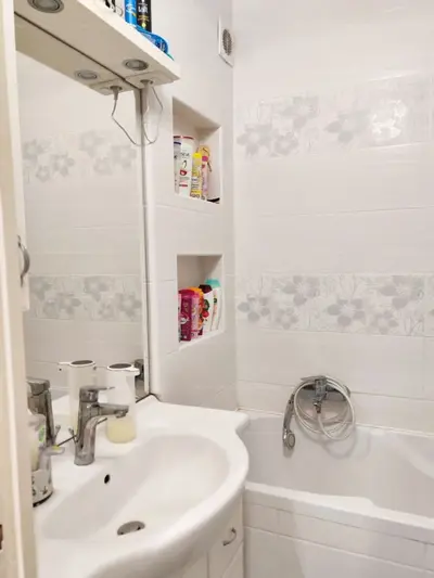 A fürdőszoba ízléses színvilágú, a vízvezetékek újak.