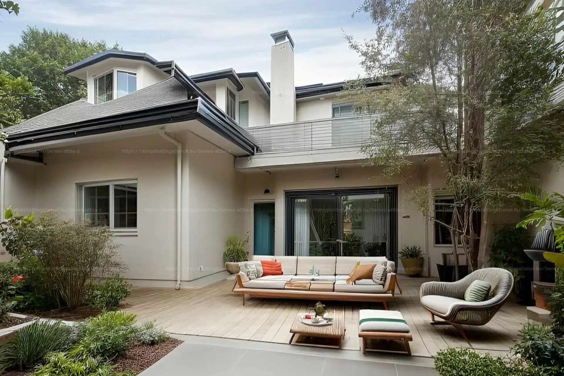 A ház egy világos, napfényes, madárcsicsergéses ősfás környezetben fekszik.