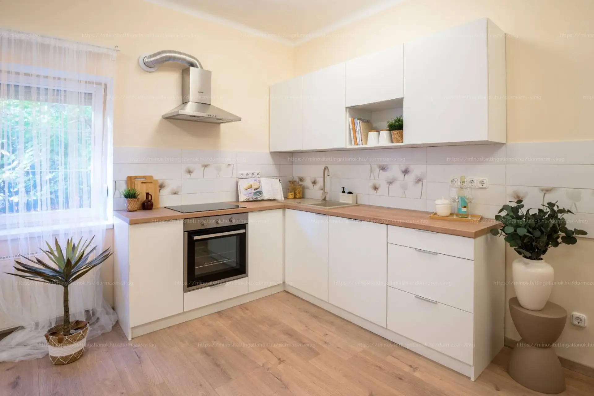 Modern gépek: indukciós főzőlap, légkeveréses sütő, mosogatógép, kivezetett páraelszívó