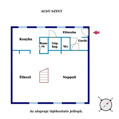 Az ingatlan földszinti részén 85 nm-en nappali-étkező-konyha tér található, emellett gardrób, külön mosdó, gépszeti és háztartási helyiség.