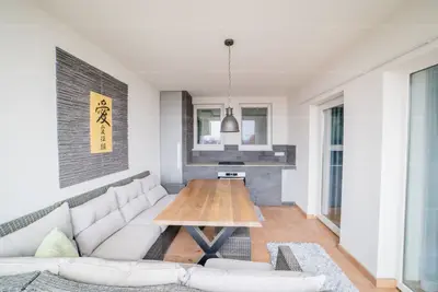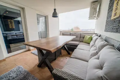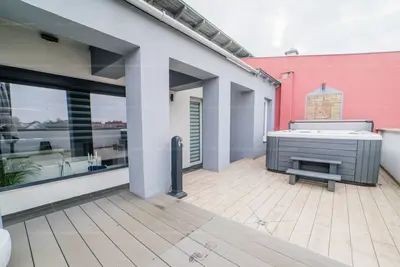 három terasszal, köztük egy 45 m²-es tetőterasszal rendelkezik.