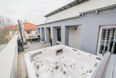 🌅 45 m²-es elkülönített tetőterasz JAKUZZIVAL, SZAUNÁVAL, városi panorámával, háborítatlan kikapcsolódás
