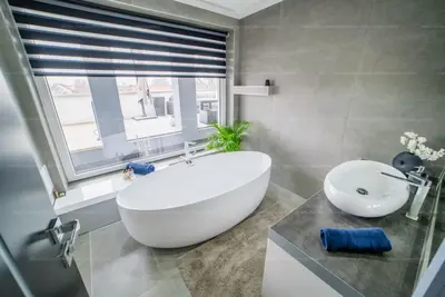 🛁 Világos fürdőszoba, szabadon álló káddal és hatalmas ablakfelülettel