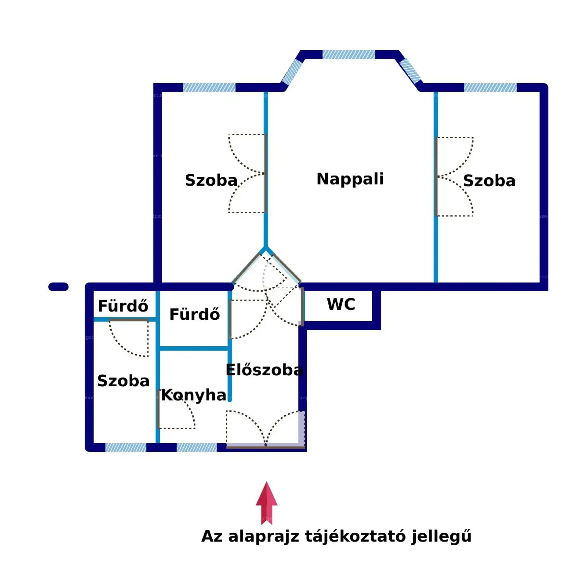 A bejáratnál elhelyezkedő konyha nappaliba történő átmozgatásával., az itt tallható szoba összenyitásával könnyedén 4 egész szobás lakás alakítható ki.