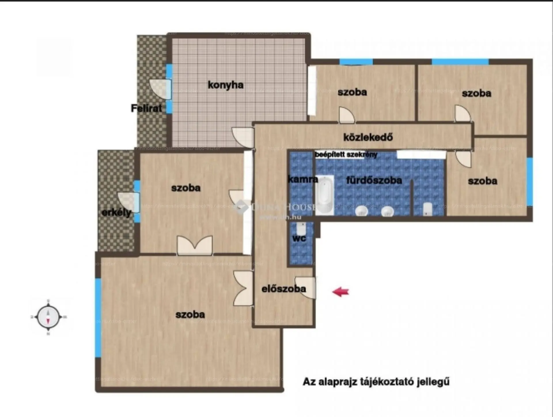 A konyhával szemben található egy 2,2 m²-es kamra. A közlekedőből nyílik három félszoba: 8,5 m², 10,3 m² és 10 m²-esek.