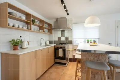Jelenlegi elosztása: napfényes, kertre néző előtér, tágas nappali (a belmagasság 2,6 m), konyhasarok, kádas, zuhanyzós fürdőszoba és hálószoba.