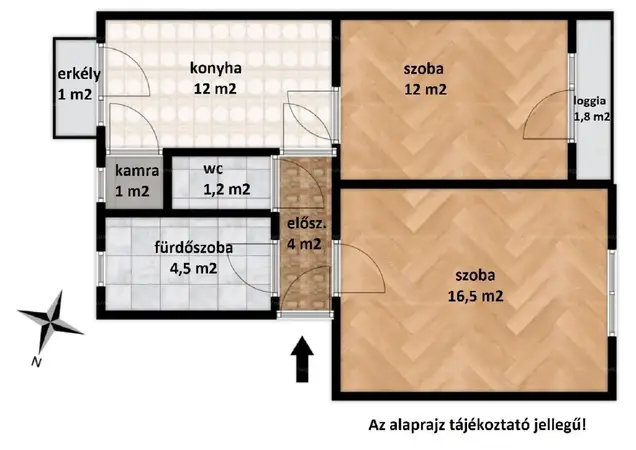 Elosztása: két szoba, konyha, kamra, fürdőszoba, külön mellékhelyiség, előszoba, erkély, és loggia. A konyha, és az erkély keleti, a két szoba a loggiával nyugati tájolású.
