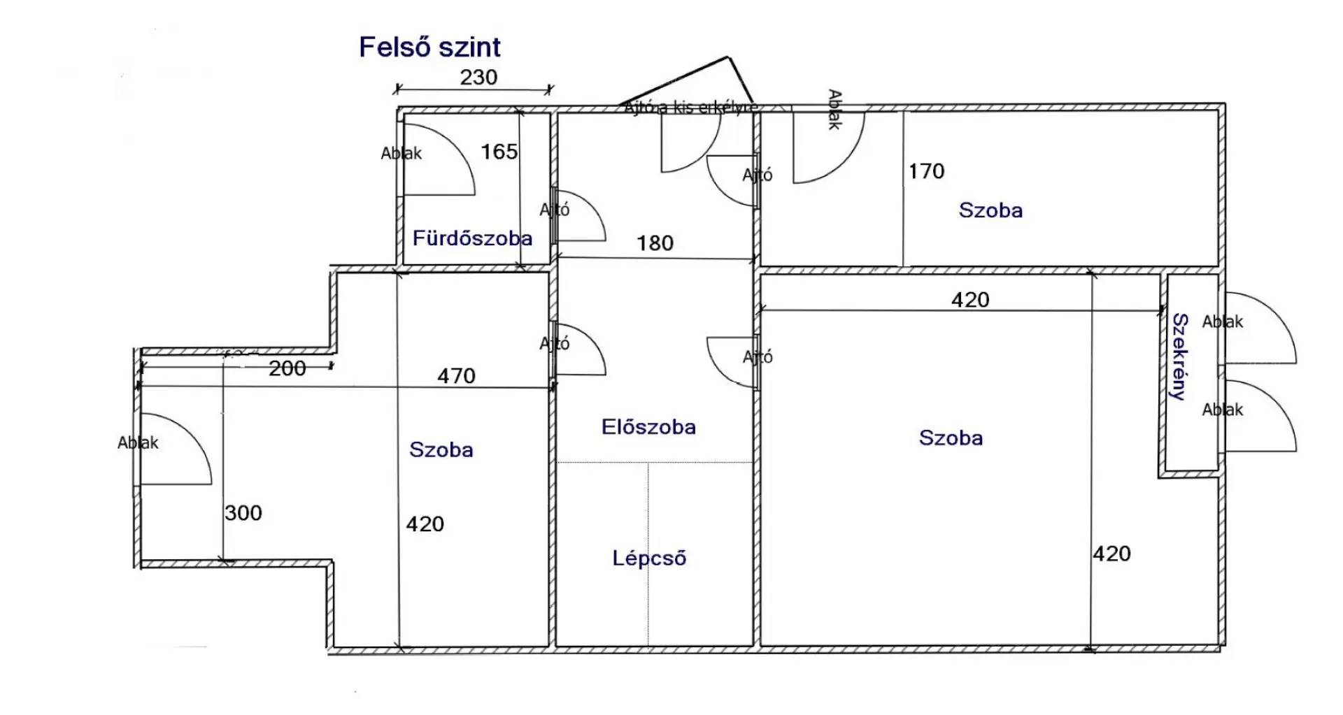 Felső szint (60 m² tetőtér) – 2 szoba (egyikben szauna), 1 fél szoba, fürdőszoba (zuhanyzó + WC).