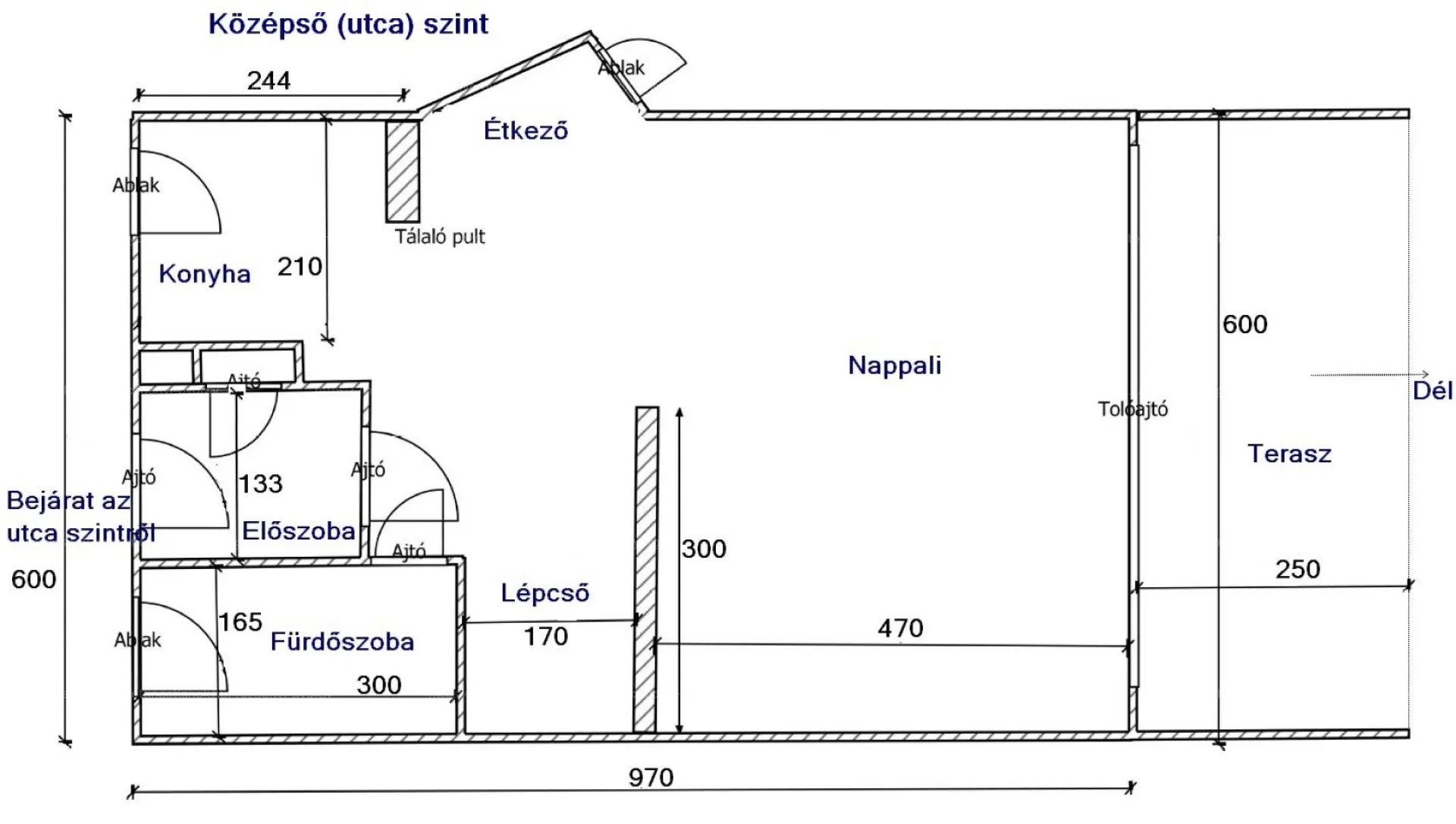 Középső szint (60 m²) – nappali, konyha, fürdőkádas fürdőszoba, 15 m² panorámás terasz.