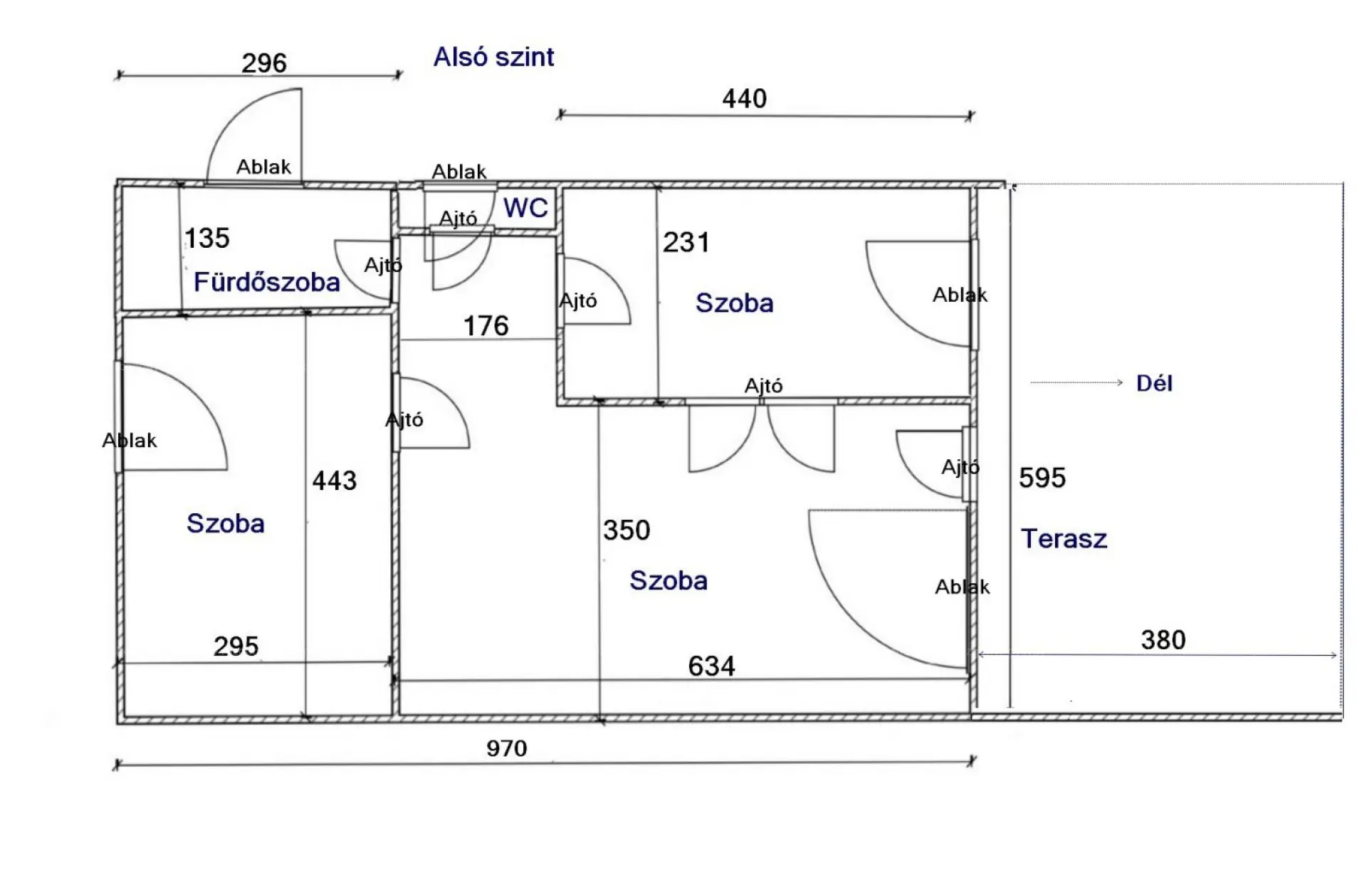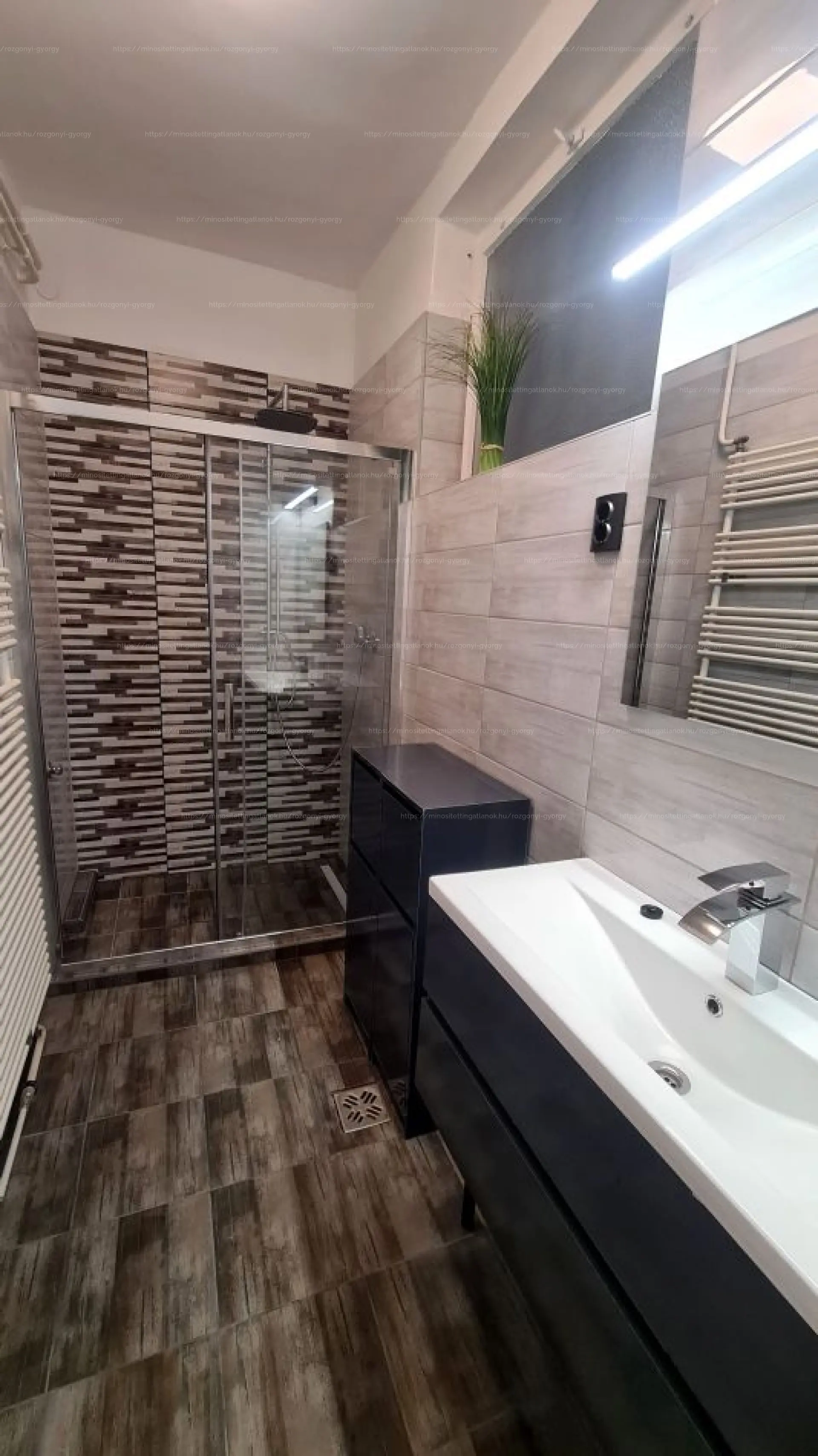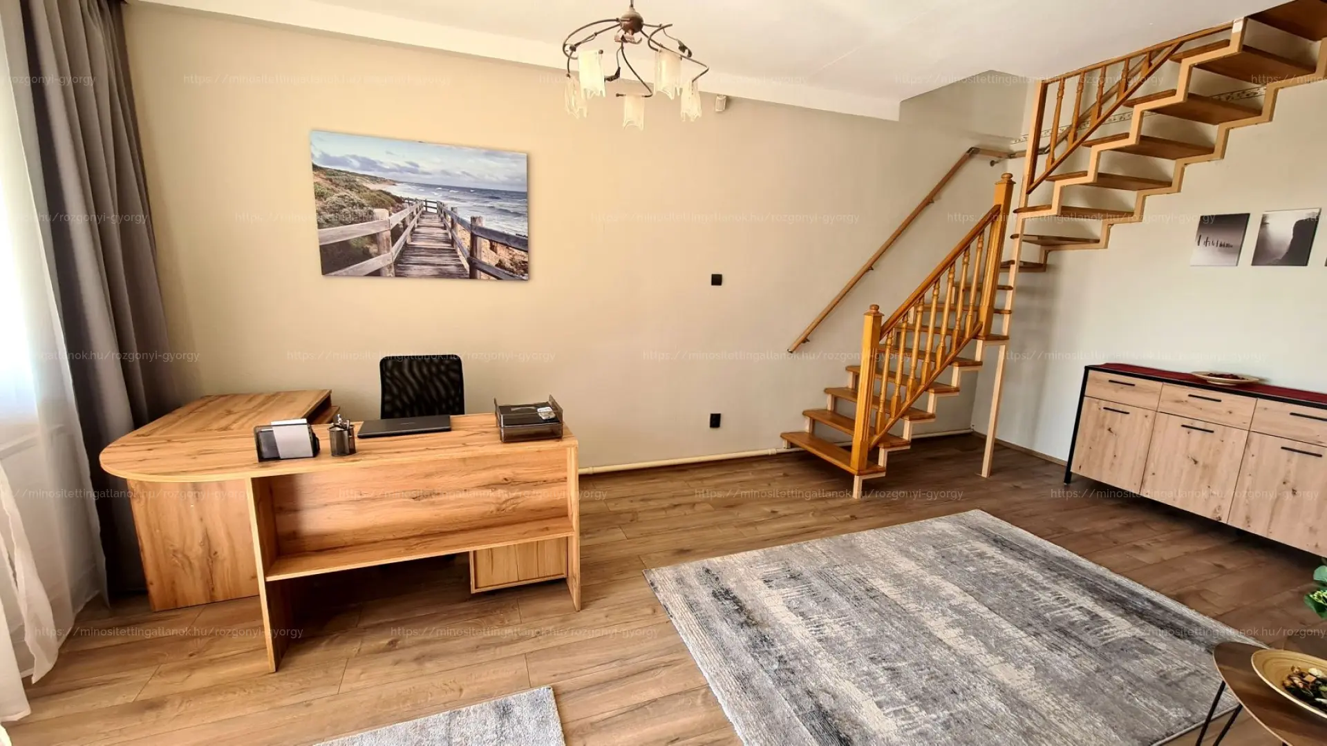 Alsó szint (60 m² + 24 m² terasz) – dolgozó + hálószoba, egy extra szoba, fürdő (zuhanyzó), külön WC.