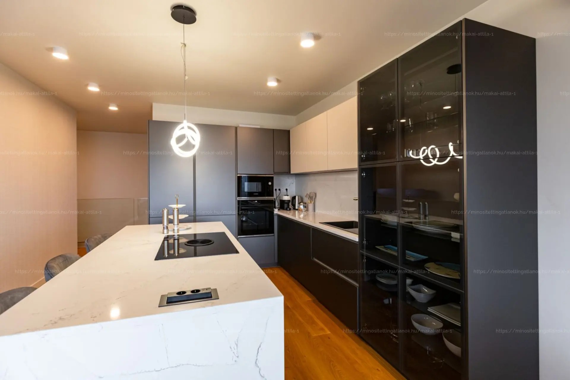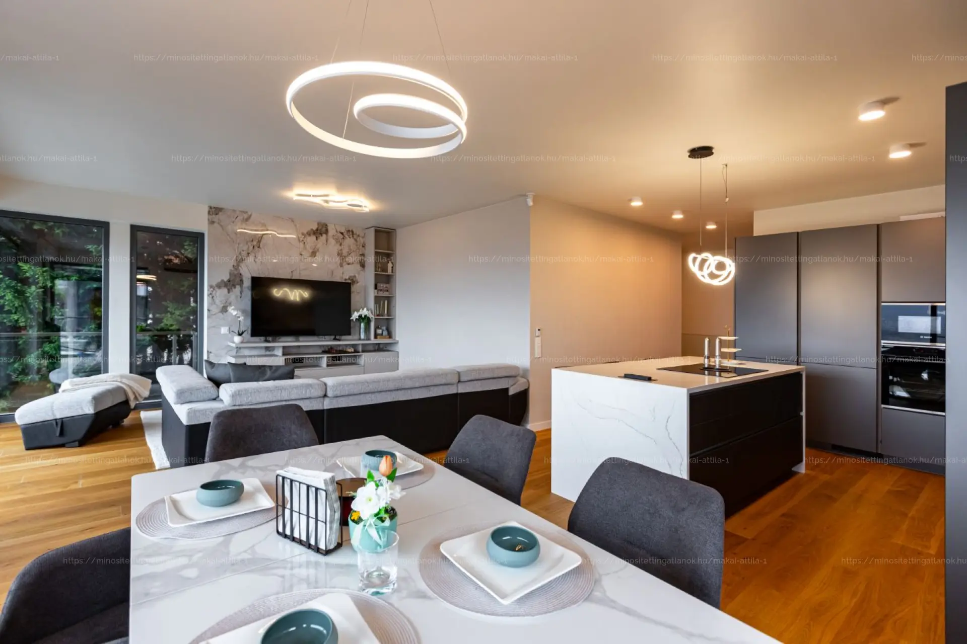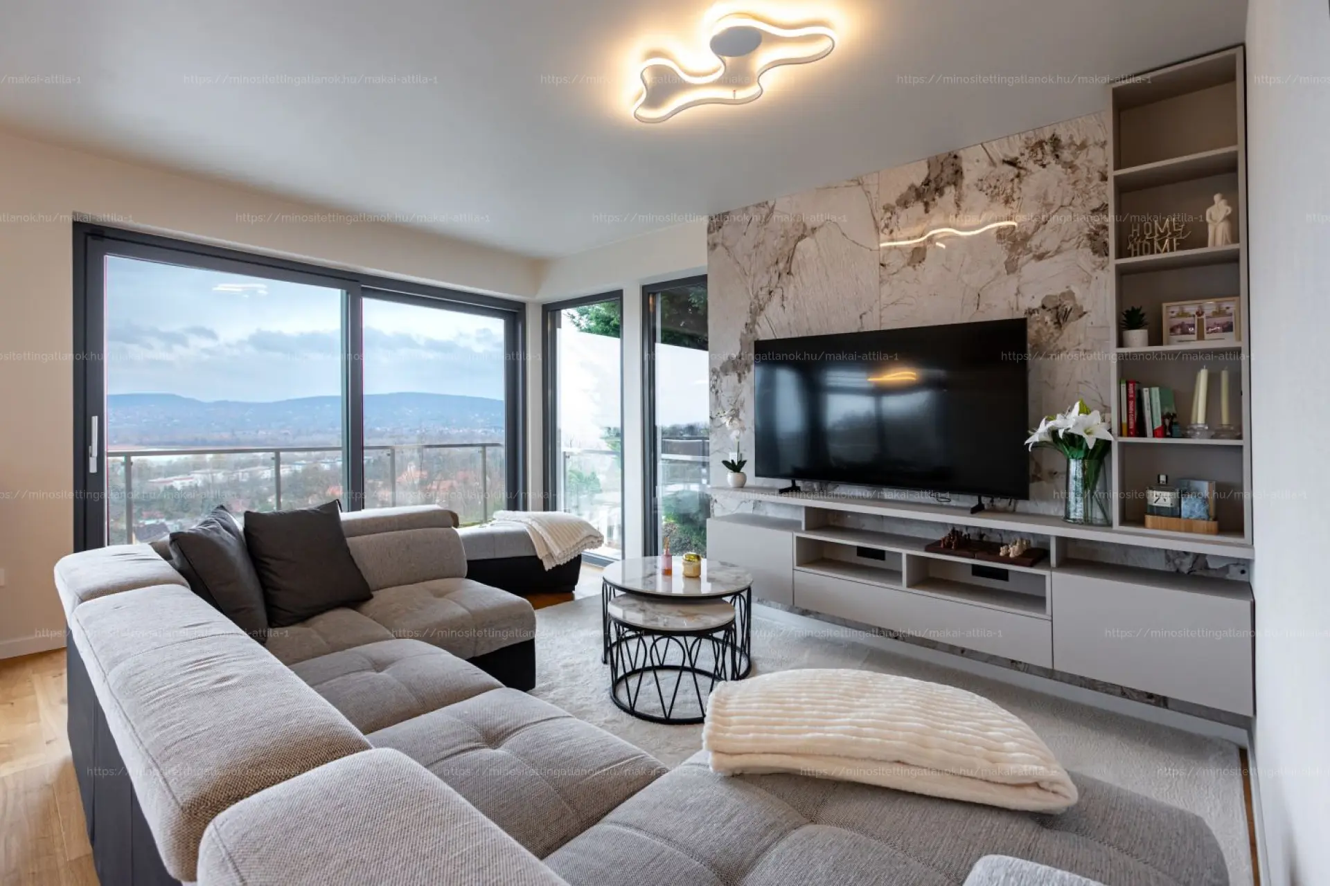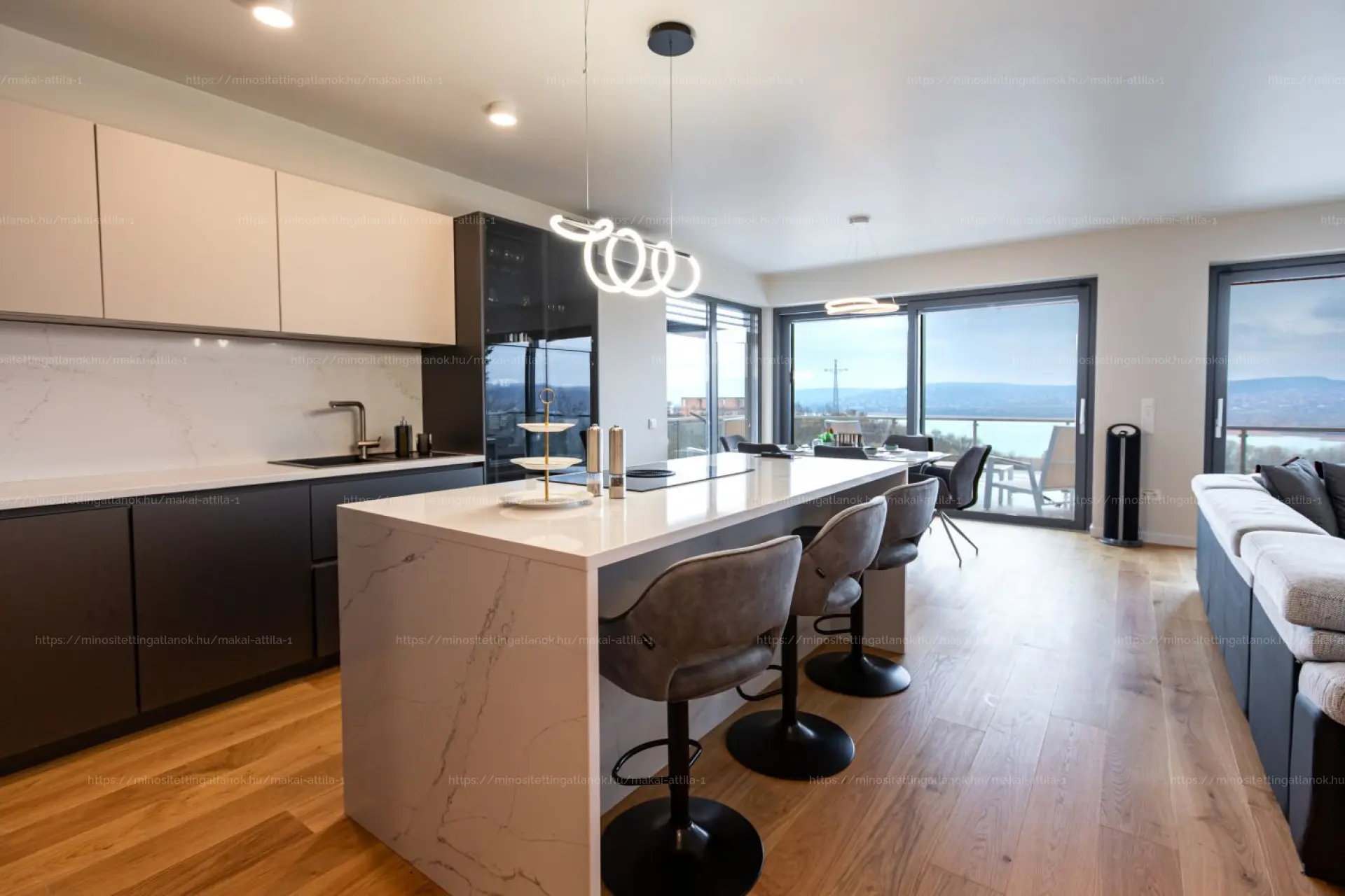 Tágas amerikai konyhás nappali hatalmas, panorámás terasszal, 2 hálószoba, elegáns fürdőszoba, külön mosdó és impozáns előtér.