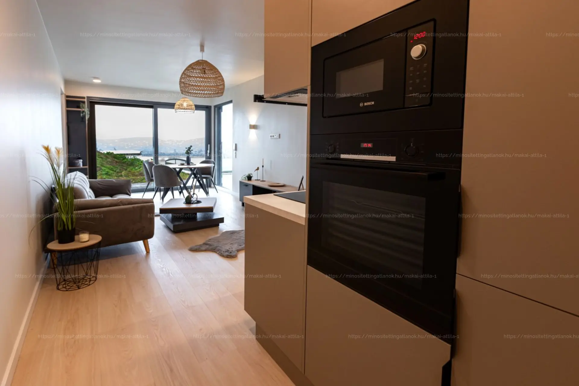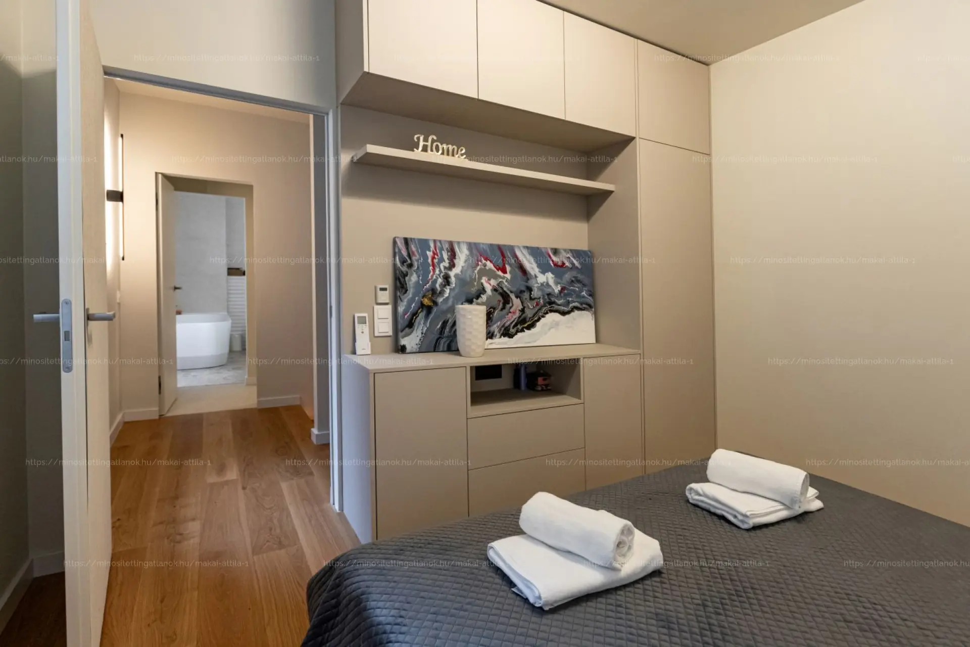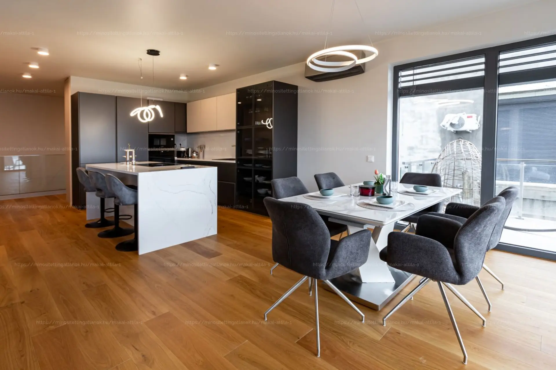 Tágas amerikai konyhás nappali hatalmas, panorámás terasszal, 2 hálószoba, elegáns fürdőszoba, külön mosdó és impozáns előtér.