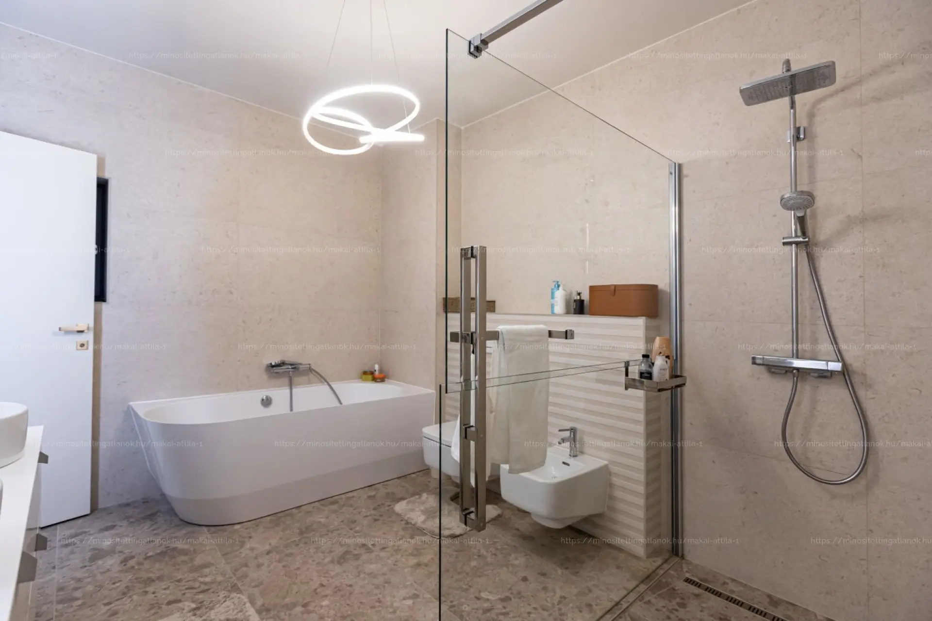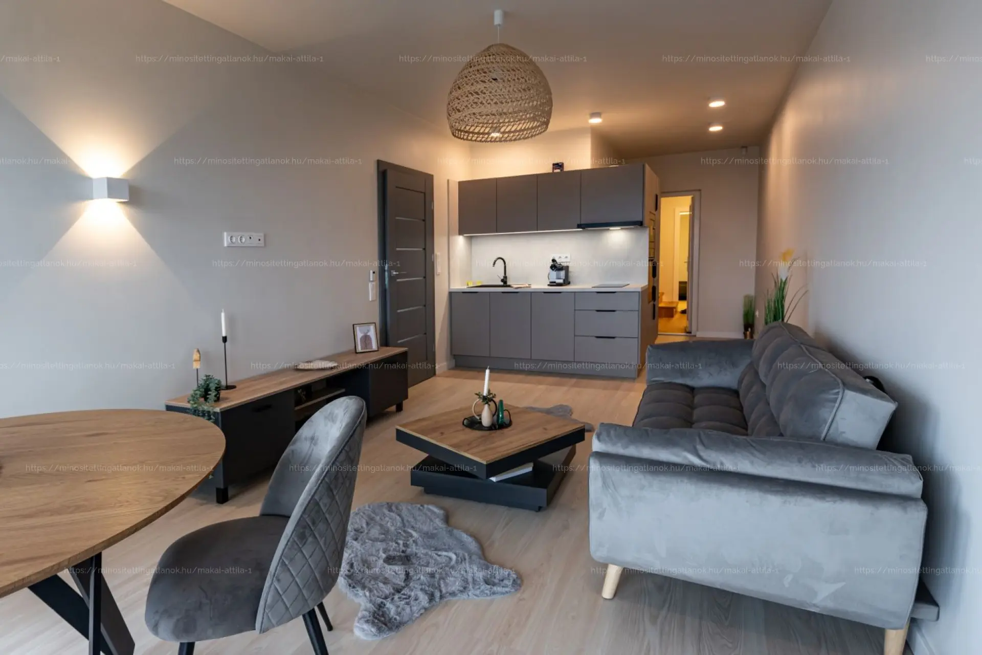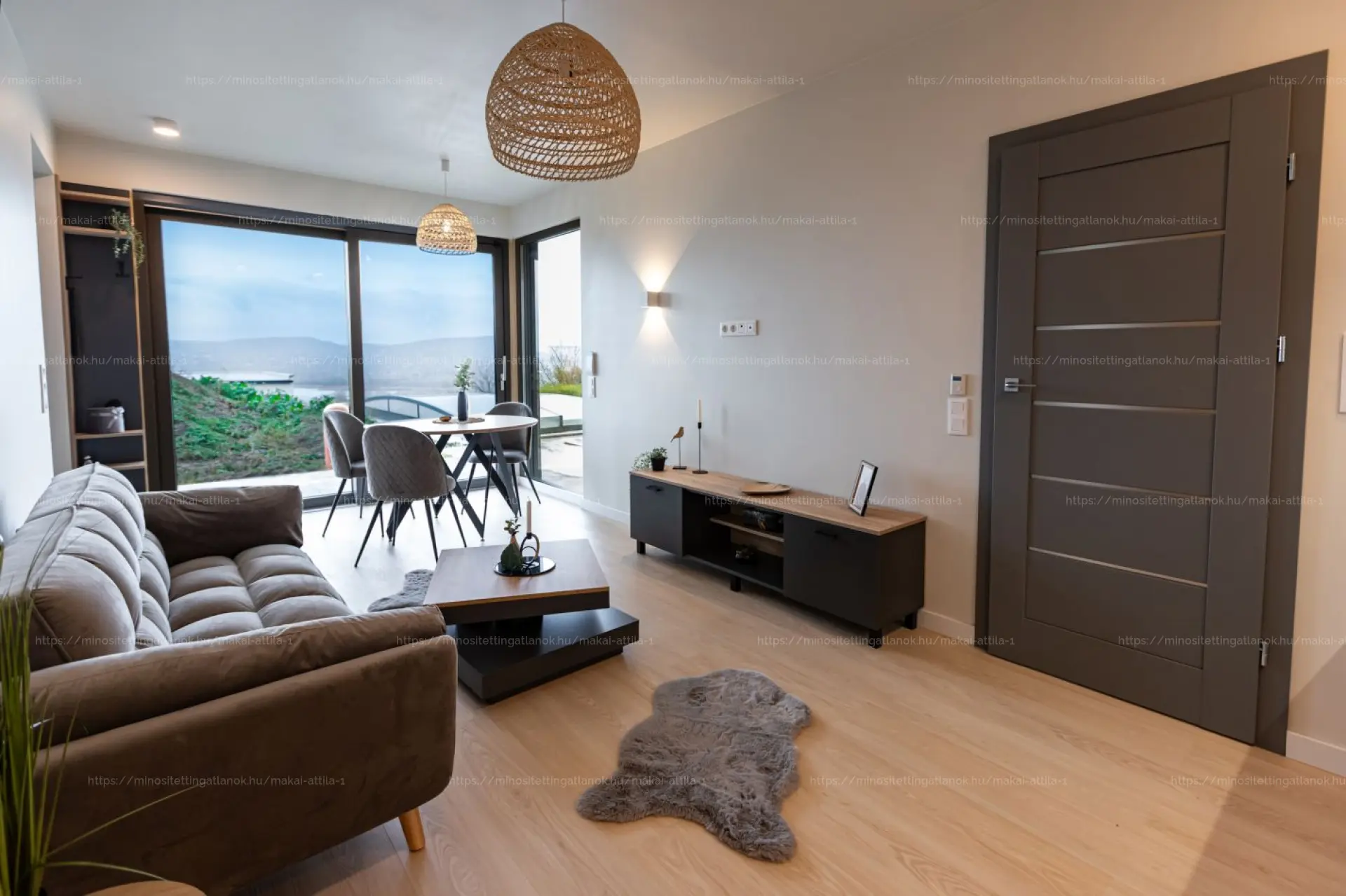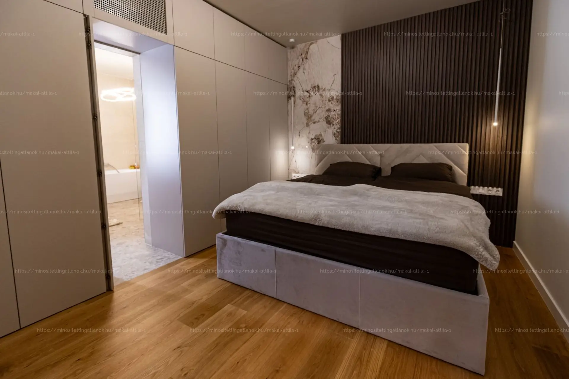 Tágas amerikai konyhás nappali hatalmas, panorámás terasszal, 2 hálószoba, elegáns fürdőszoba, külön mosdó és impozáns előtér.