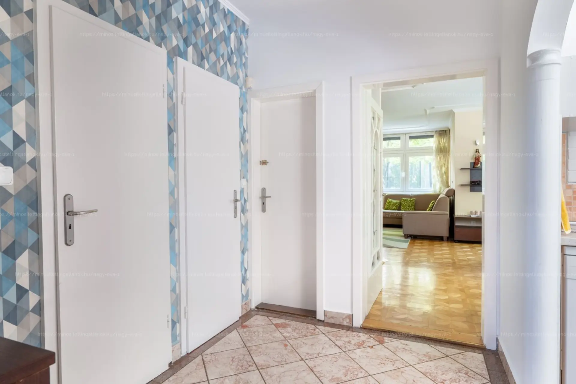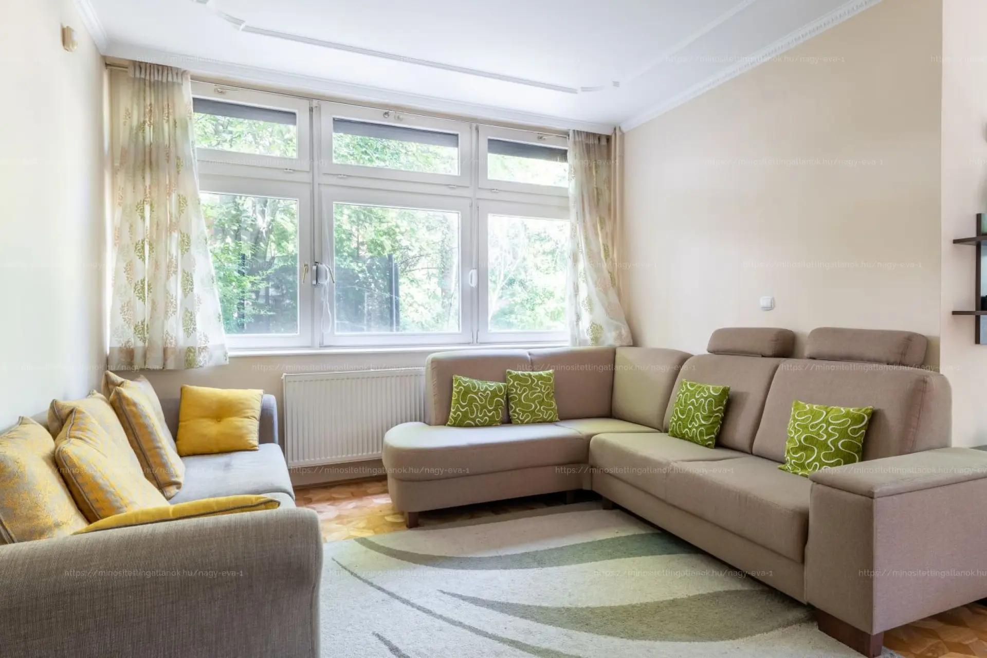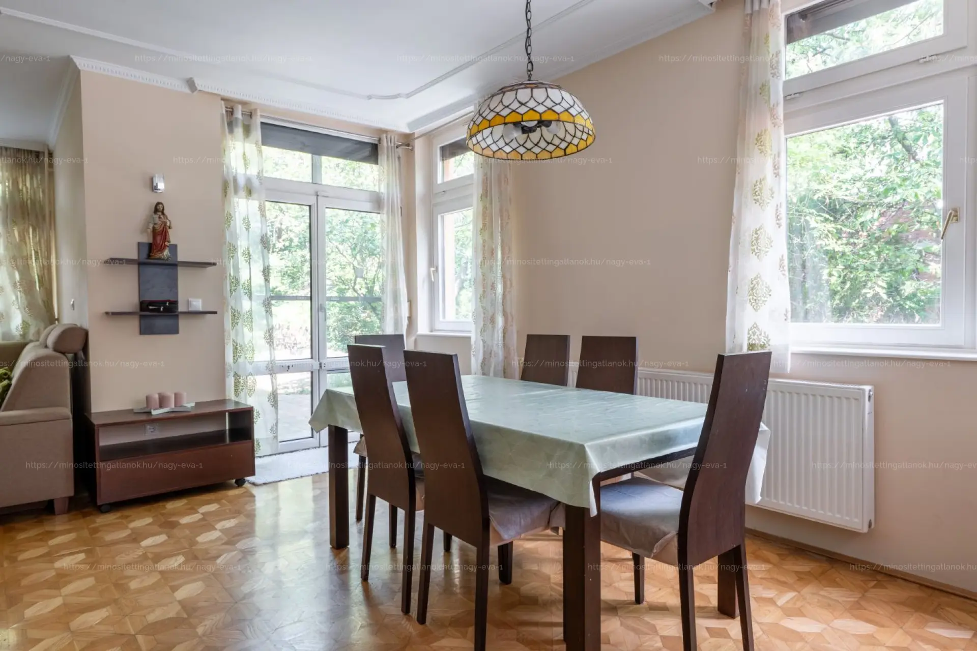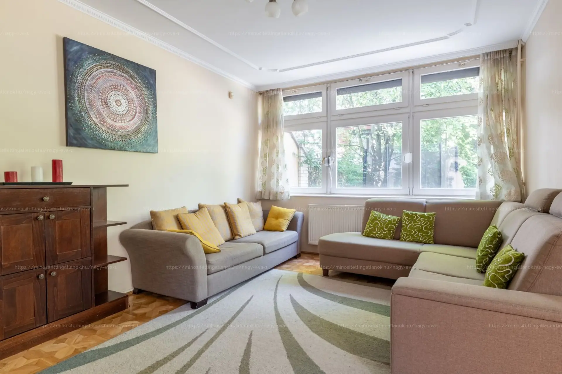 A nappaliban található egyedi, kézműves intarziás parketta igazi ritkaság, különleges hangulatot ad az otthonnak.