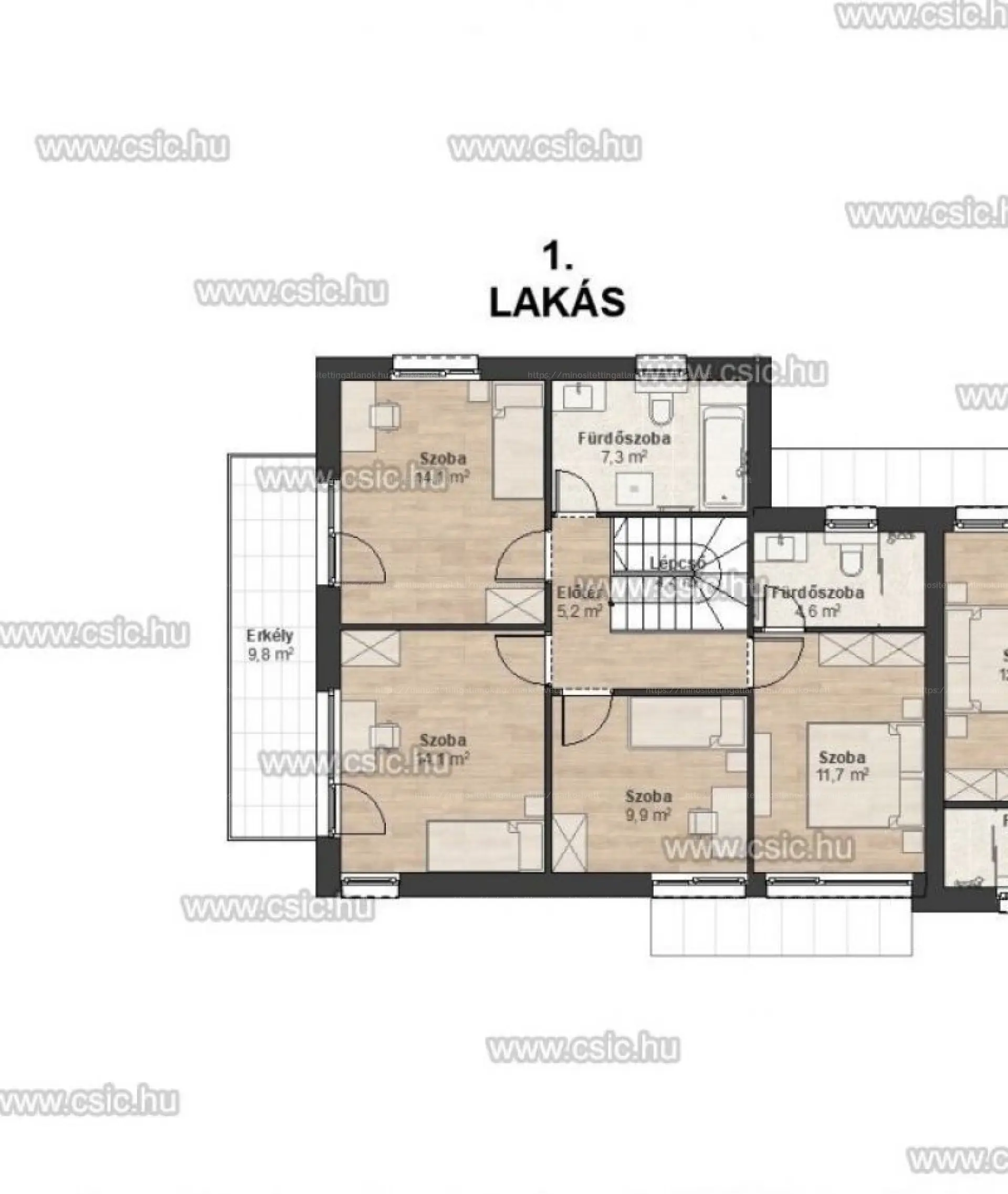 A 141 nm LAKÓTÉR + 30 nm TERASZ, ERKÉLYES-es kiváló elrendezésű, ideális választás családok számára. Alaprajzon az 1. számú lakás.