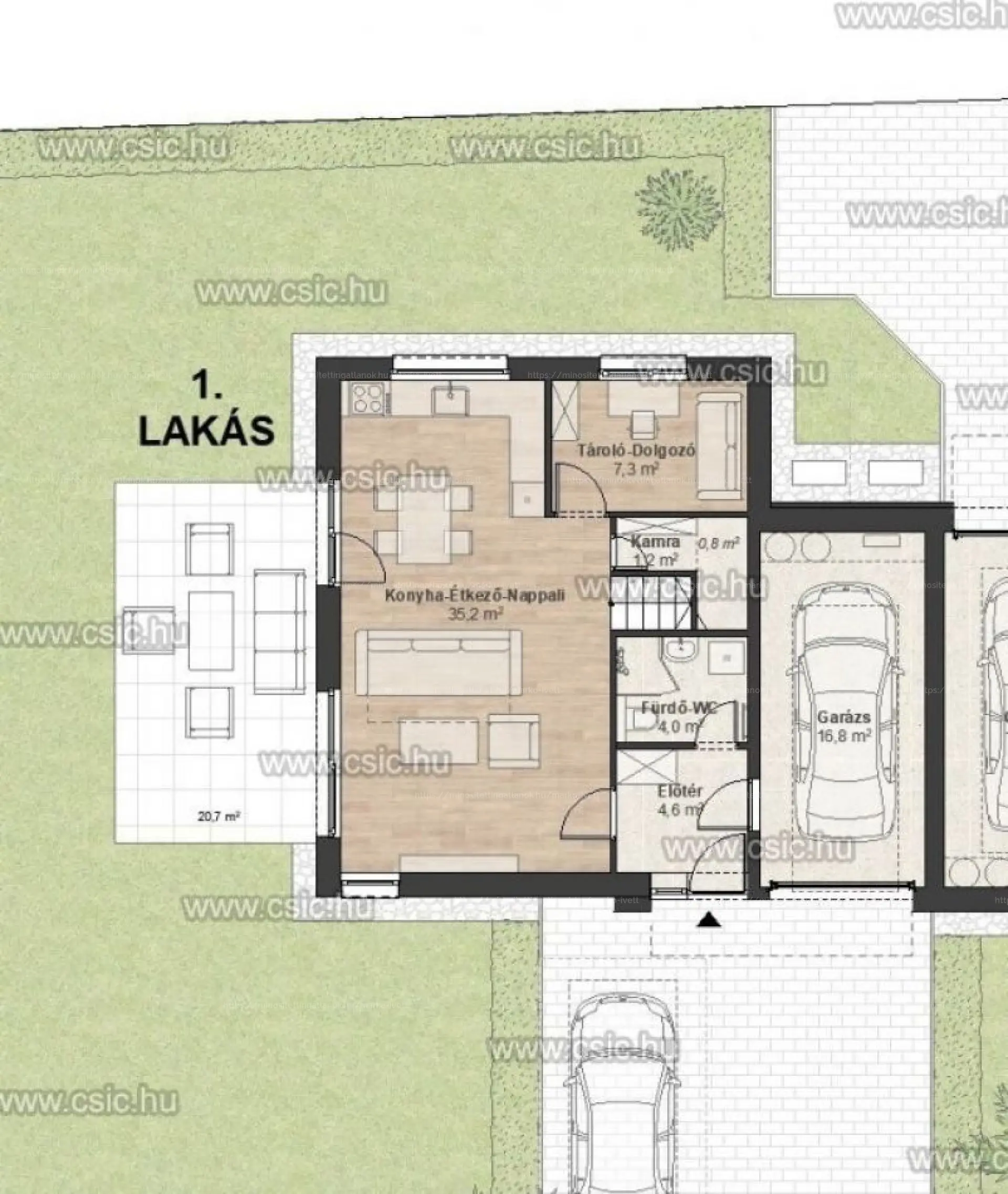 - 1 autónak GARÁZS (17 nm) és 1 autónak kialakított FELSZÍNI PARKOLÓ az árban,