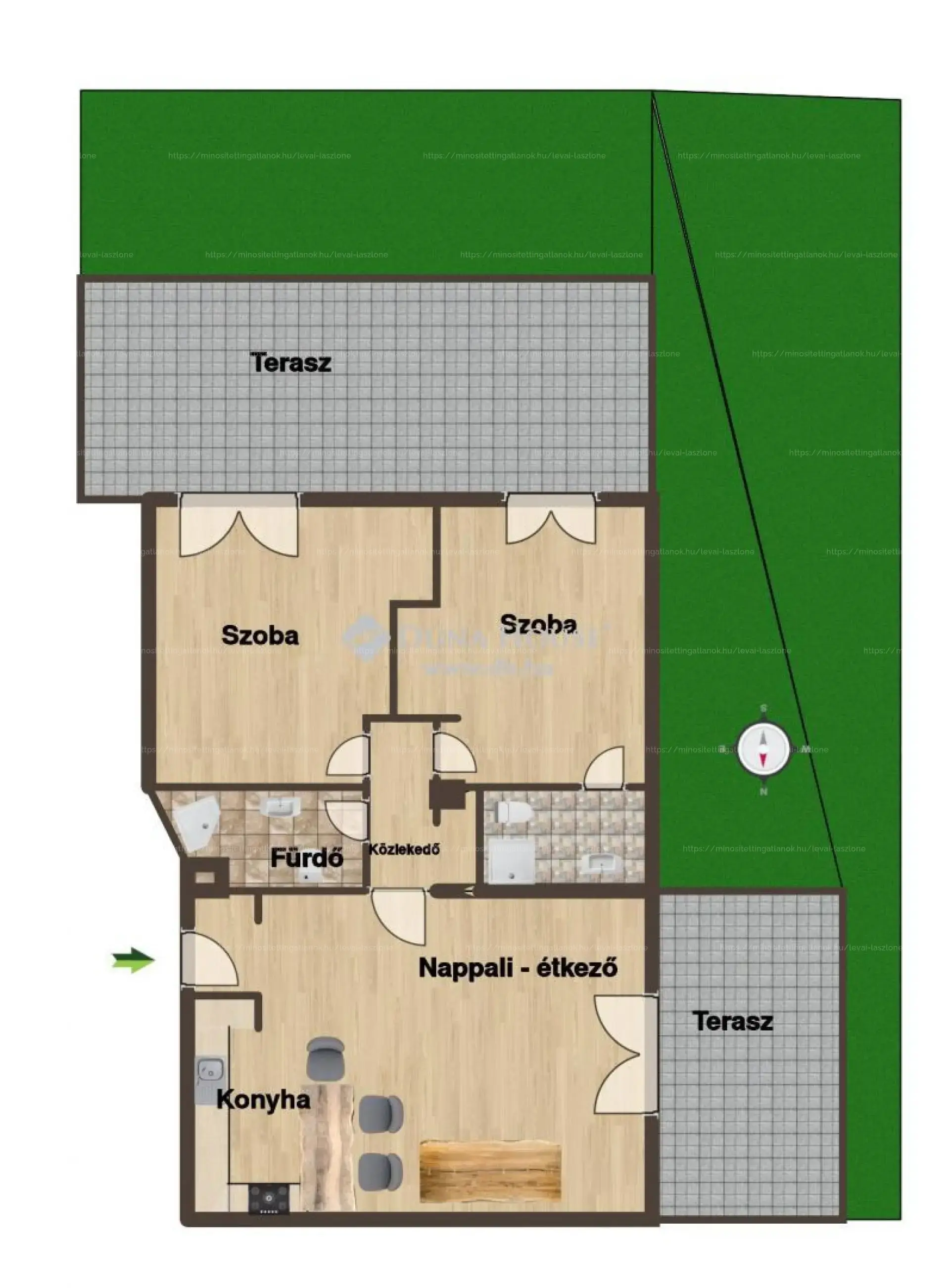 - nappali-étkező-konyha egy légtérben, ahonnan közvetlenül egy tágas terasz nyílik,