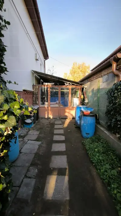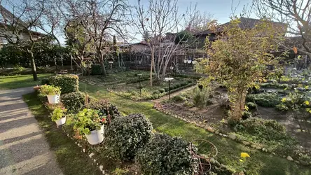 Két aszfaltos utcáról is bejuthatunk a telekre, az egyik ilyen beállóhoz kapcsolódik egy garázs. A kert ápolt, állandóan napfényben fürdik.