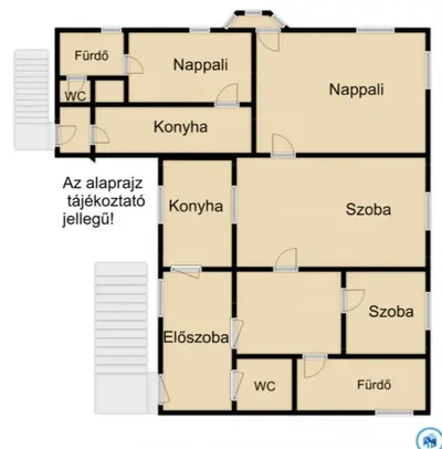 A kisebbik nappali, konyha, fürdőszobából áll, a nagyobbik pedig nagy nappalit, két szobát, konyhát, fürdőszobát és wc-t tartalmaz. Mindkét lakásnak külön bejárata van, külön lépcsősor, a két lakás teljesen elszeparált egymástól.