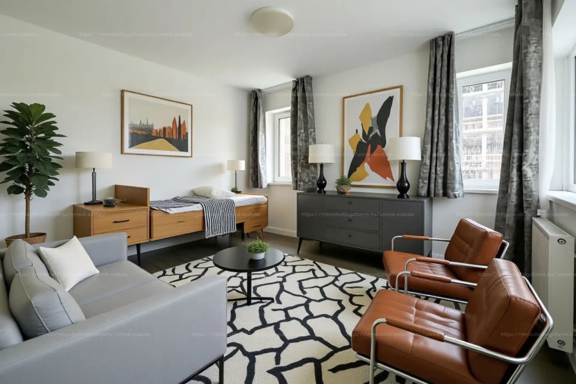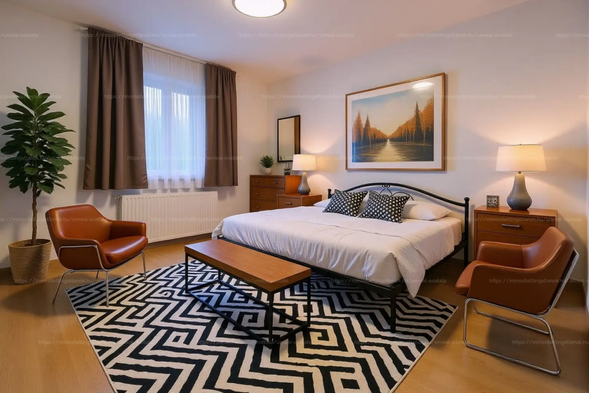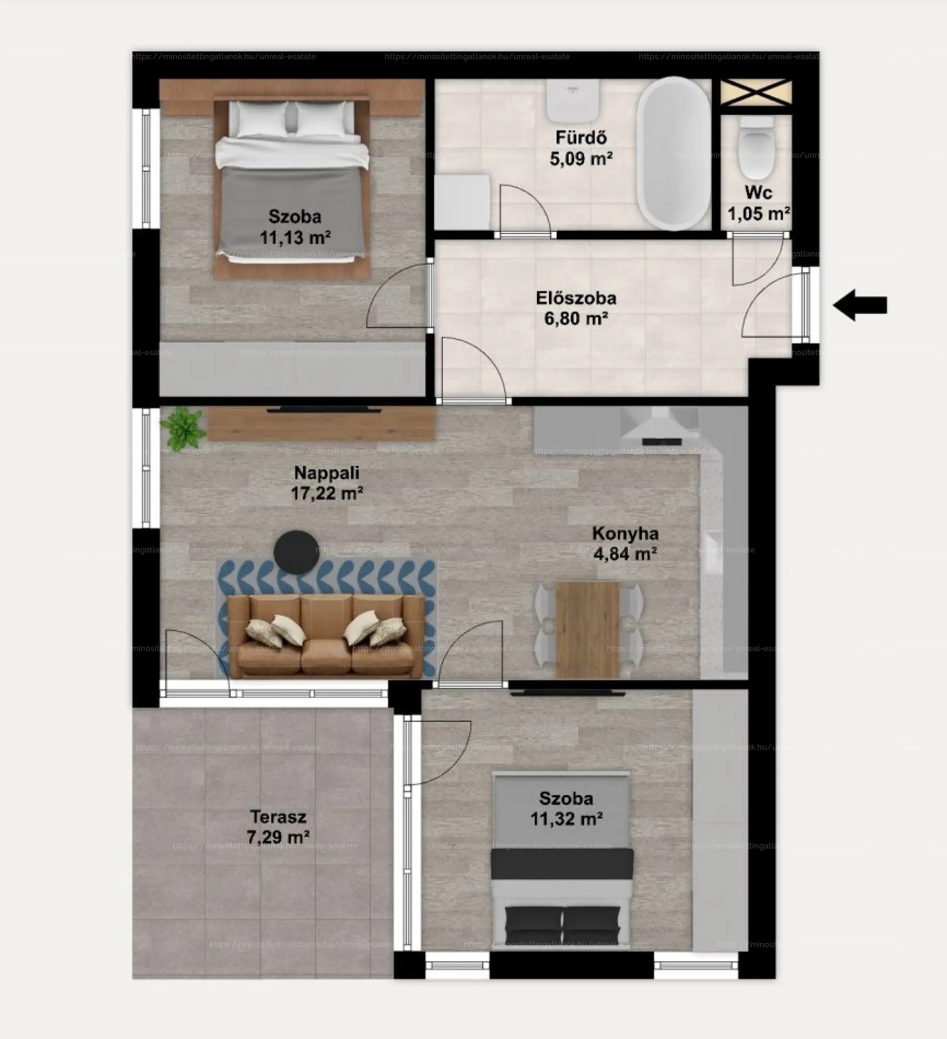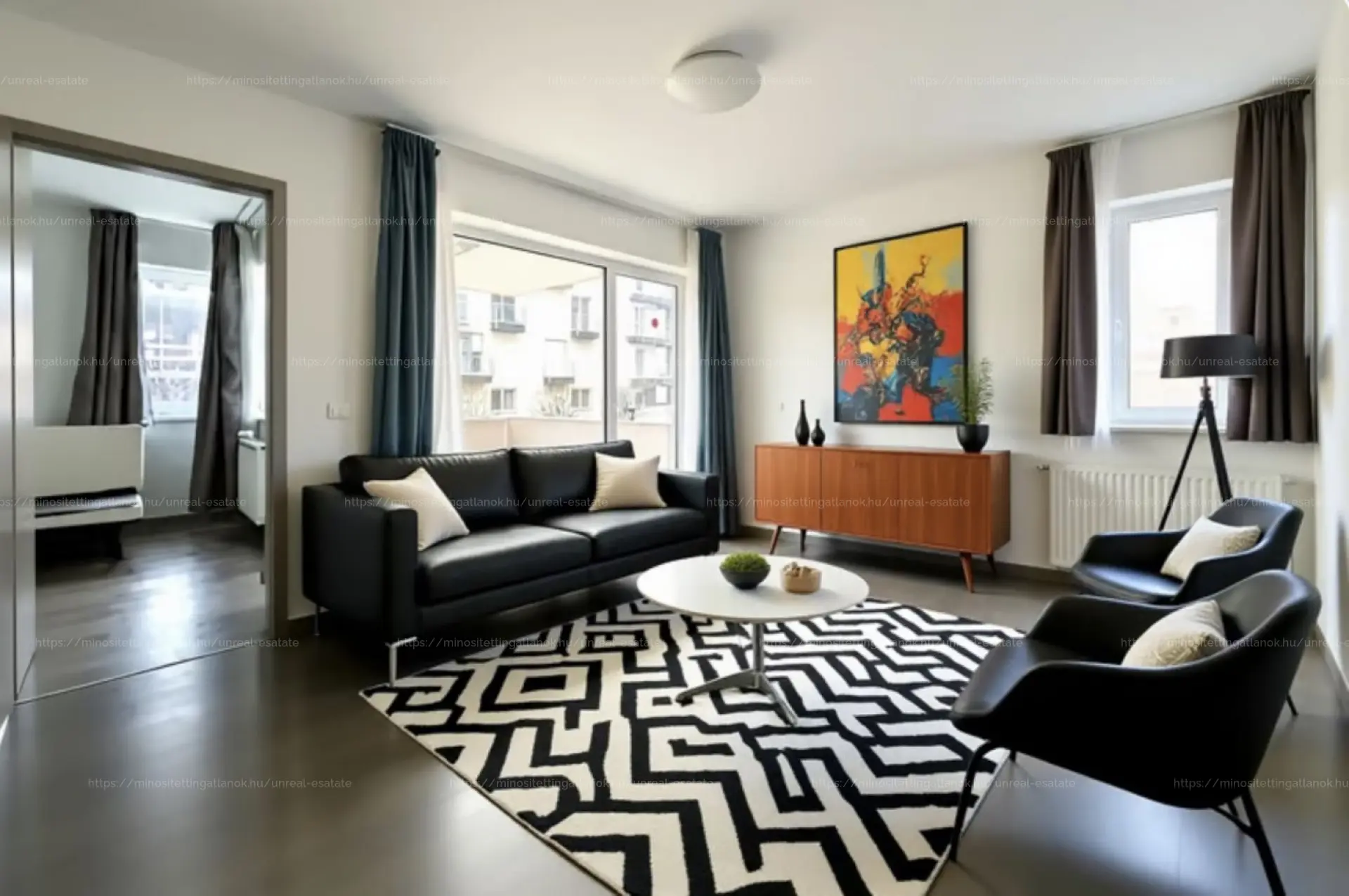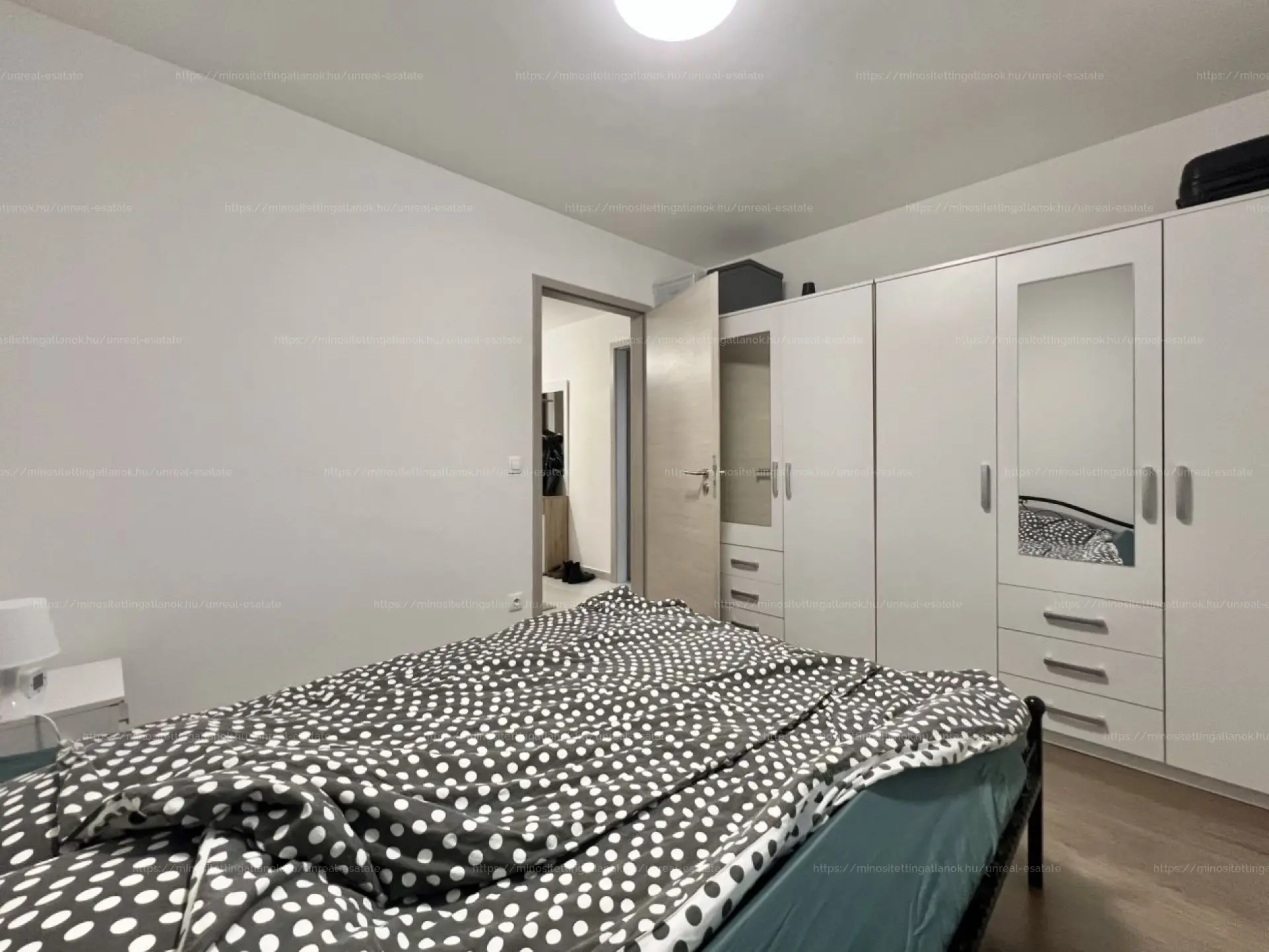 - Nappali és szobák: Tágas amerikai konyhás nappali + két külön nyíló, egyenként 11 m²-es hálószoba (egyik déli, másik nyugati fekvésű).